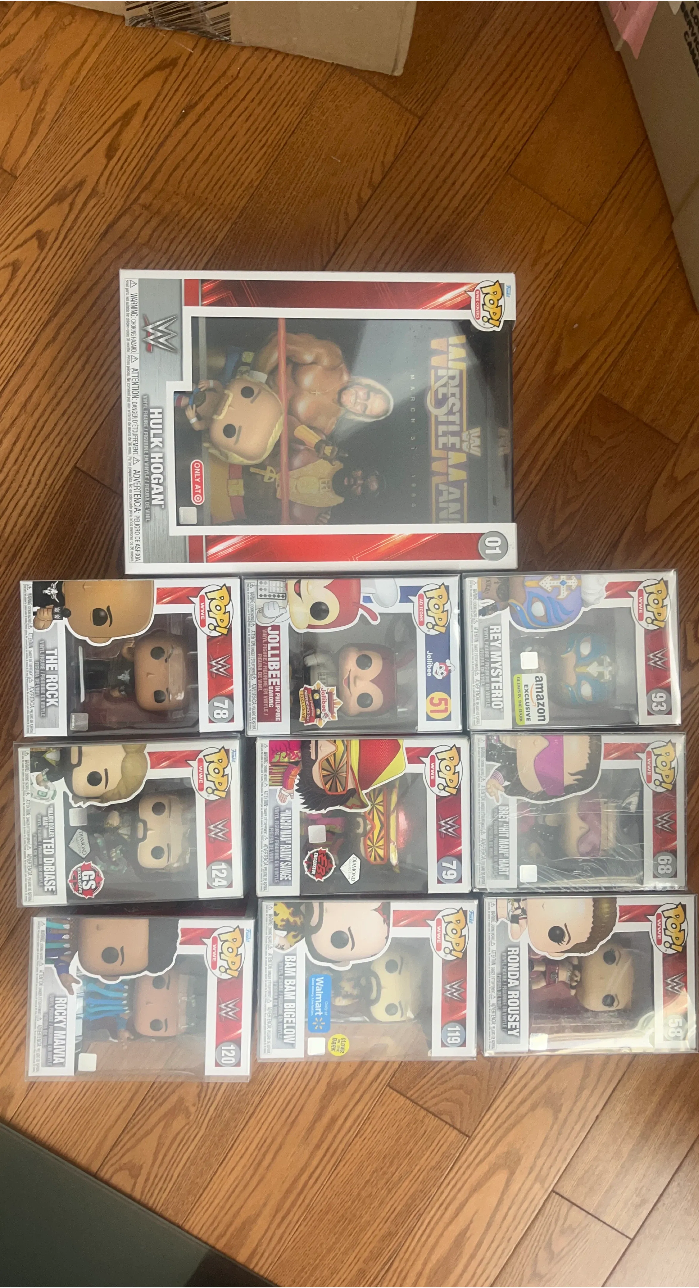 Collection of WWE Funko Pop! figures including Hulk Hogan, The Rock, and Ronda Rousey. Figures come in original boxes with various WWE characters represented. Perfect for any wrestling fan's collection!