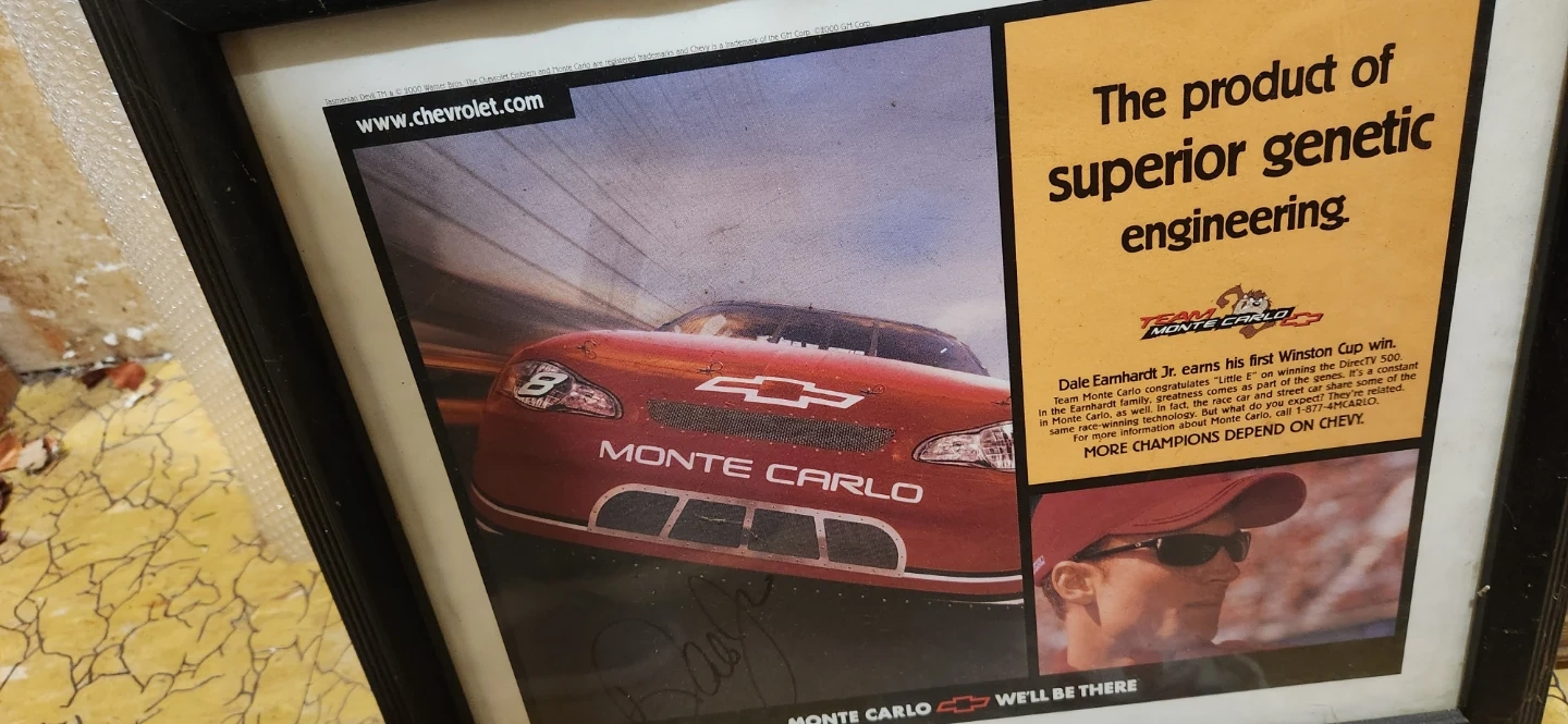 This is a print advertisement for the Chevrolet Monte Carlo. It celebrates Dale Earnhardt Jr.'s first Winston Cup win and highlights the car's racing technology. The ad features the slogan "More Champions Depend on Chevy."