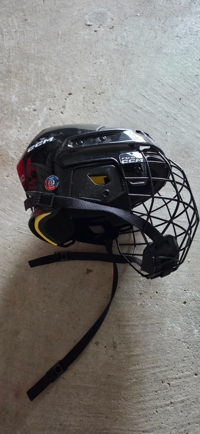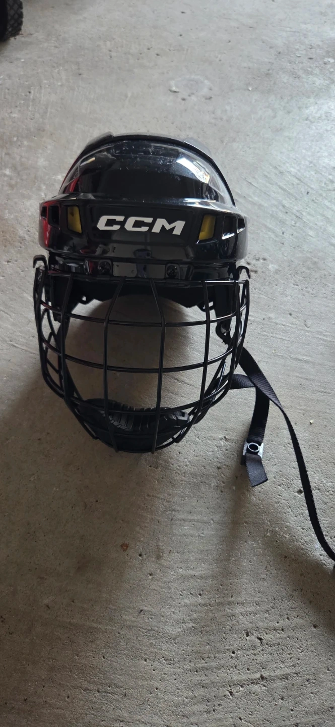 CCM XTIO hockey helmet in black. Size medium. Includes a cage for full facial protection. Original box is present. Age for 7-10