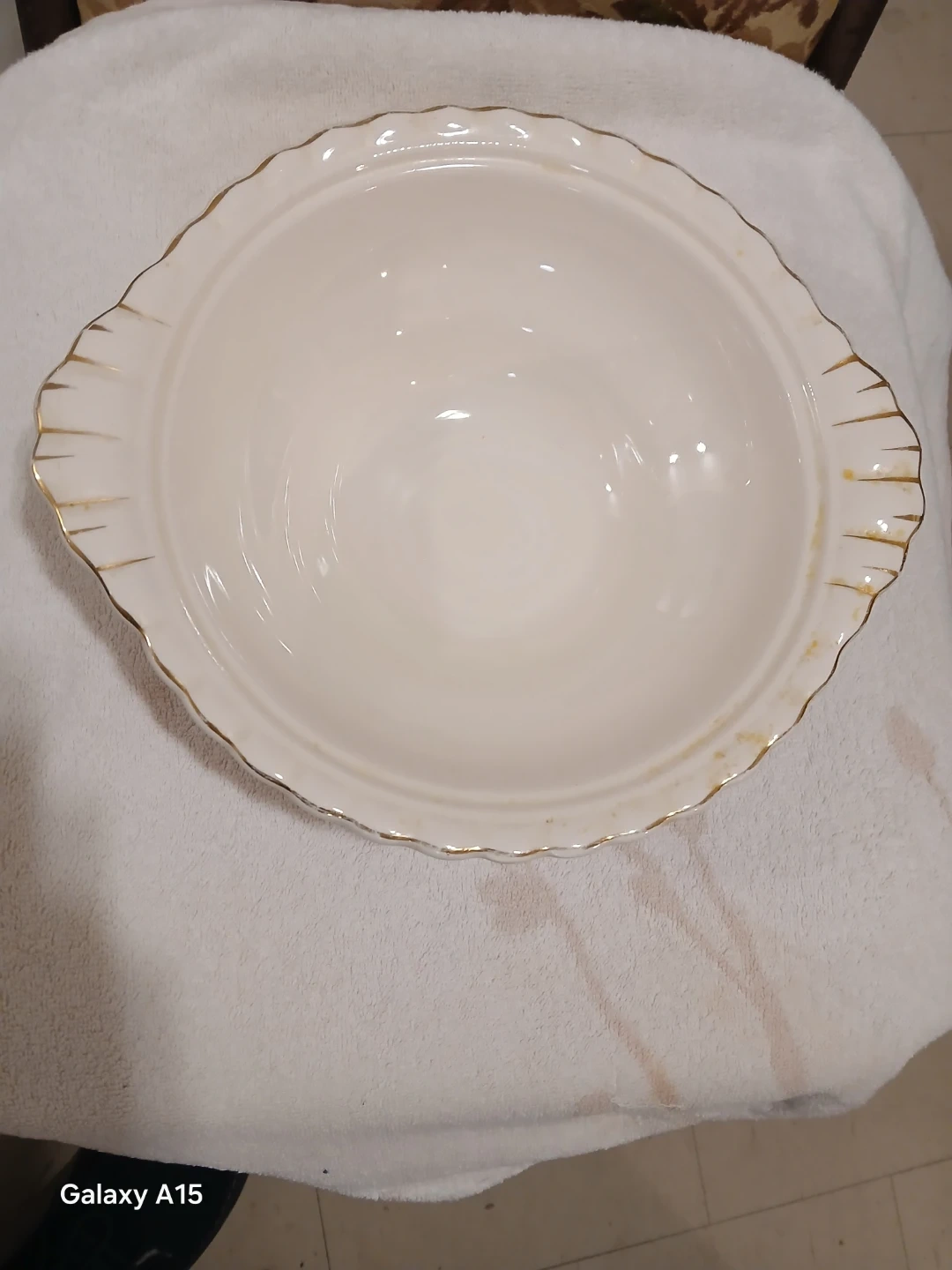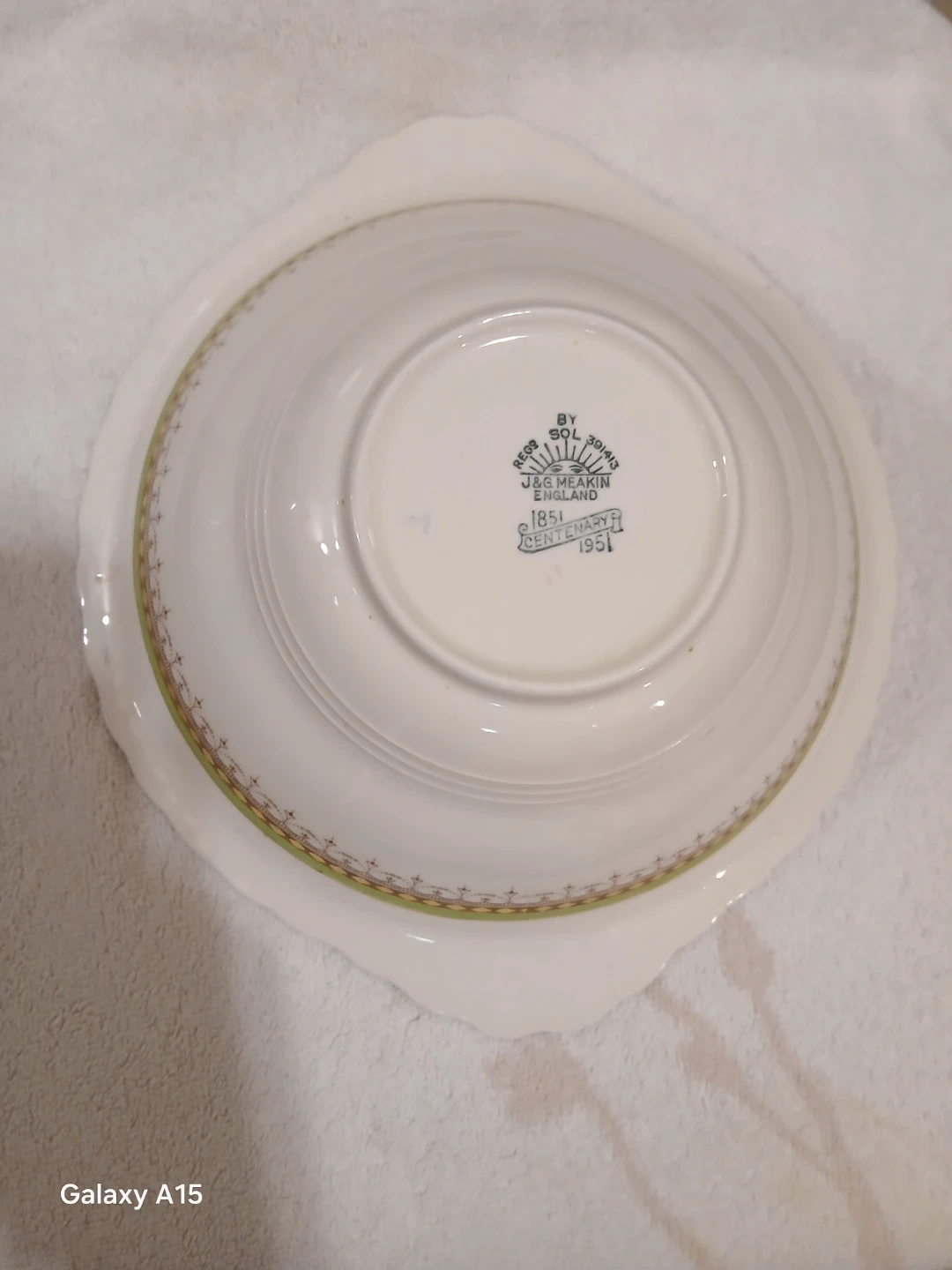 A lovely J&G Meakin serving bowl from their 1851 Centenary collection. It's white with gold trim and a decorative border. This bowl is perfect for serving side dishes or desserts at family gatherings. This is to mark the 100th anniversary.
