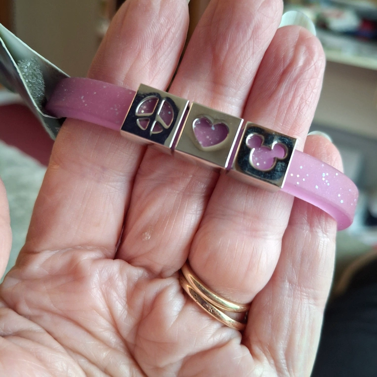 Selling a cute Walt Disney World bracelet! It's a lovely pink colour with silver-tone charms featuring a peace sign, heart, and Mickey Mouse head. Perfect for adding a touch of Disney magic to your outfit