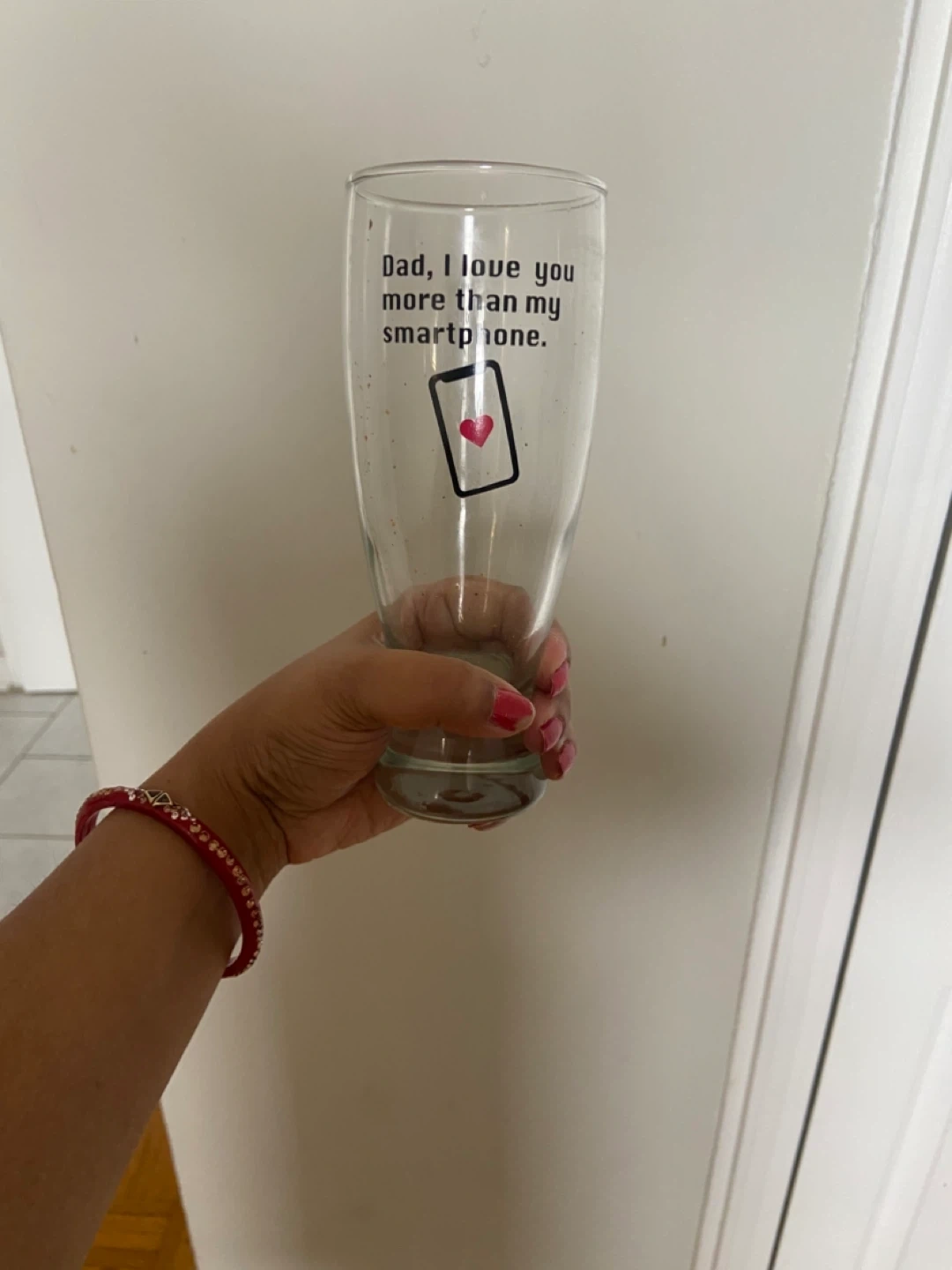 Glass with "Dad, I love you more than my smartphone" printed on it. Features a smartphone icon with a heart. It's a thoughtful gift for Father's Day or any occasion! This glass is perfect for Dad.