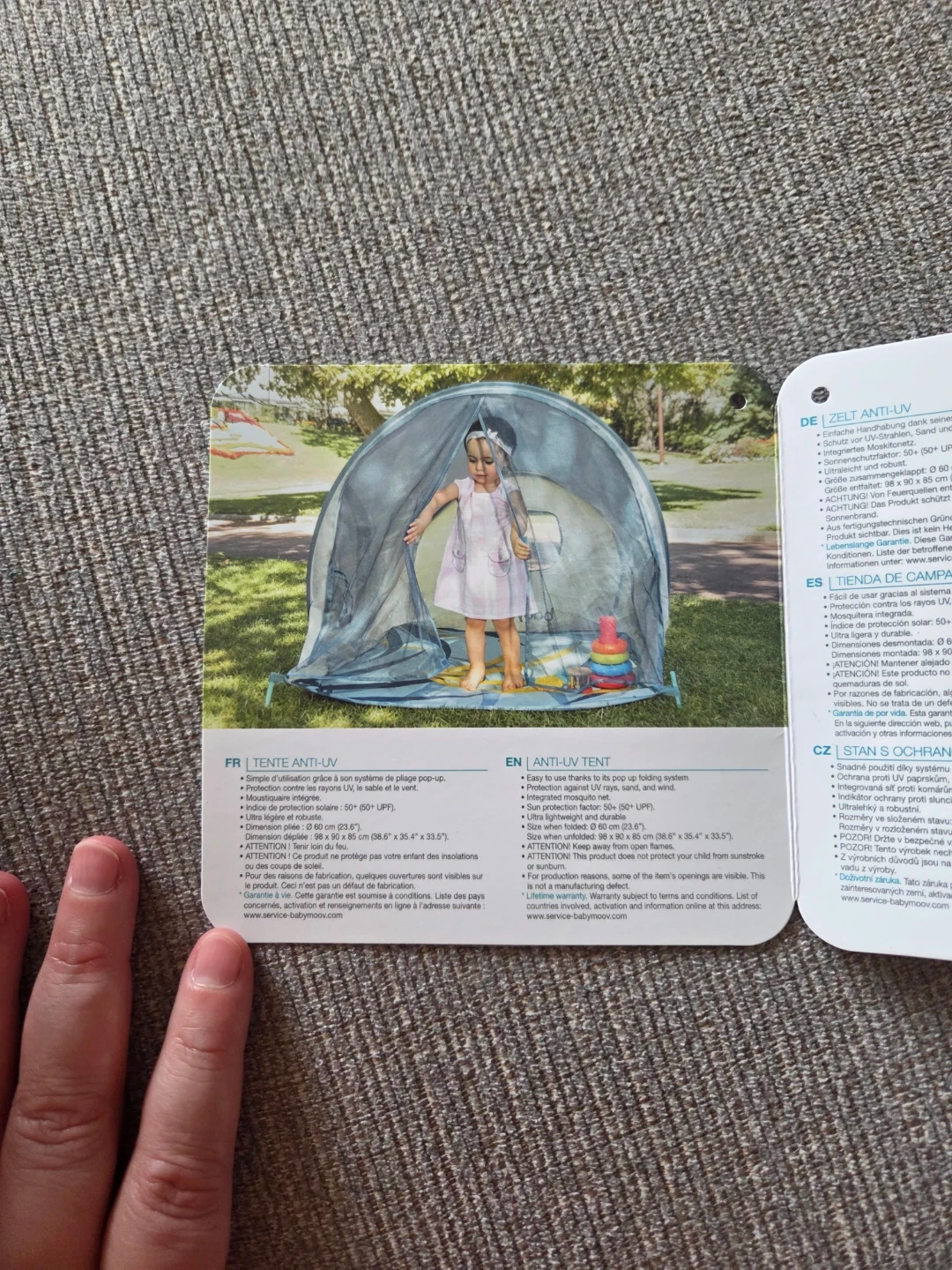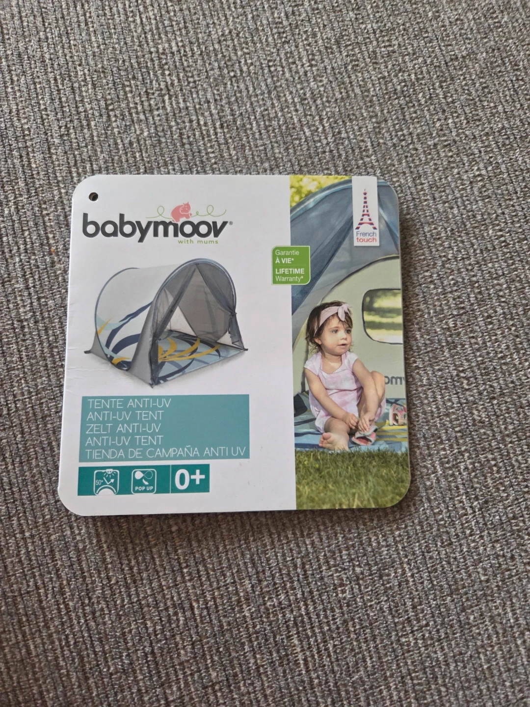 This is a Babymoov anti-UV pop-up tent for babies. It's designed to protect children from the sun. The tent has a diameter of 80 cm and is suitable for newborns and up (0+).
