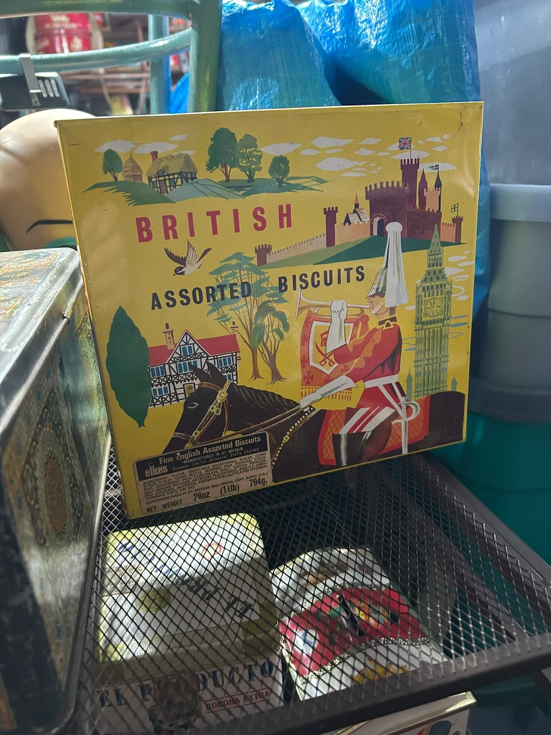 Vintage Elkes British Assorted Biscuits tin. Manufactured in Great Britain. Net weight 28oz (794g). This tin features a classic British scene with Big Ben and guardsmen.