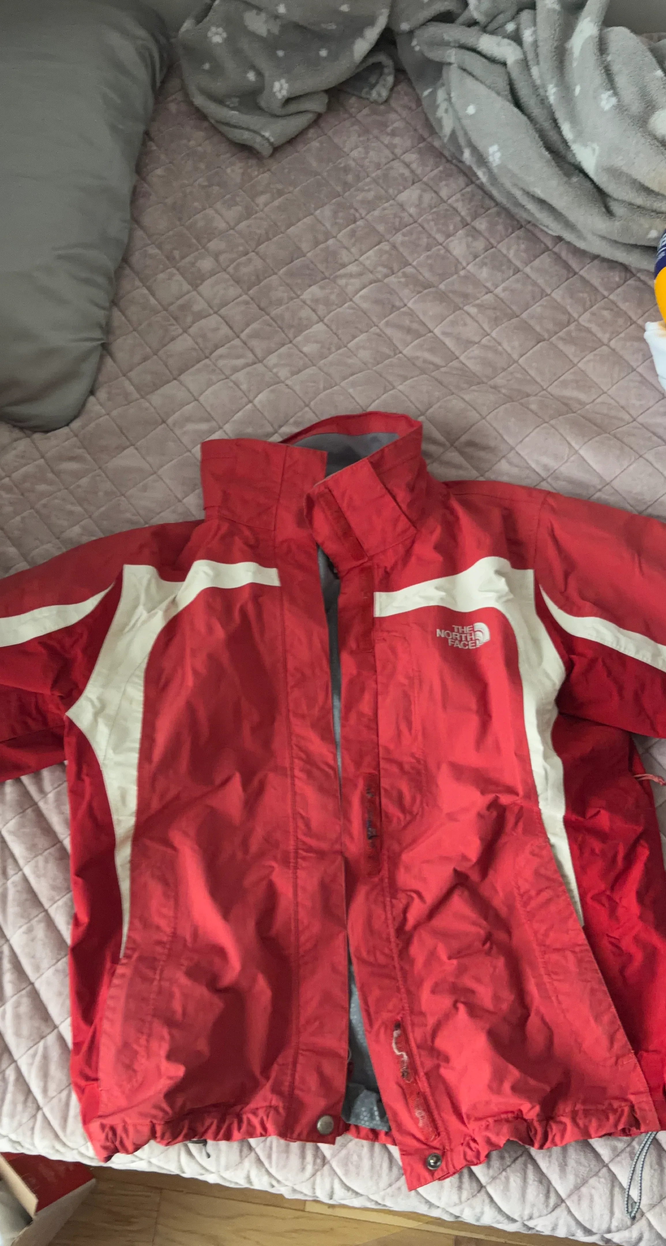 This is a red and white jacket from The North Face. It's made for outdoor activities. It has a durable shell and a comfortable lining. Pretty good condition. Women’s large but can fit a men’s medium