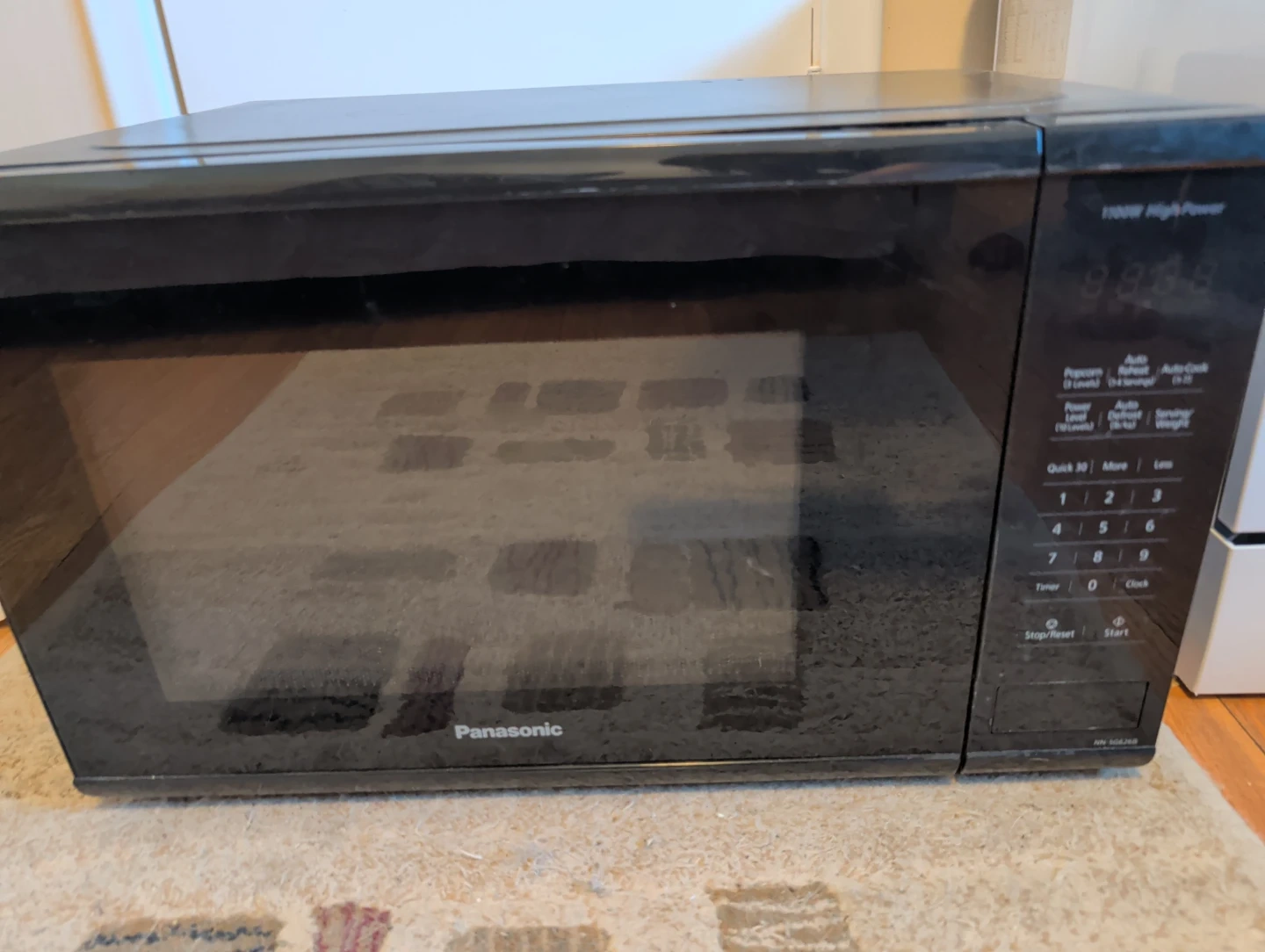 Panasonic microwave oven with 1100W high power. Features auto-cook and defrost settings. Quick 30 seconds and timer functions are included. This is a black countertop model.