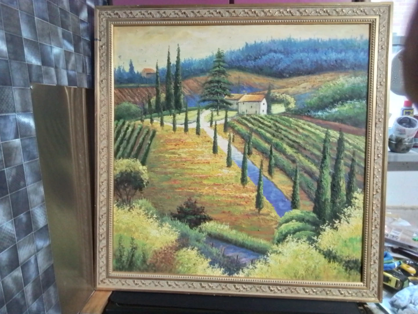 I'm offering a beautiful, used Tuscan landscape original oil painting, sized at 34x34 inches. This painting captures the serene beauty of the Tuscan countryside with its rolling hills and classic architecture. The painting is in great condition and is framed, ready to hang and bring a touch of Italian charm to your home. Based on similar art pieces on Kijiji, a reasonable price for this painting is around $150.00.