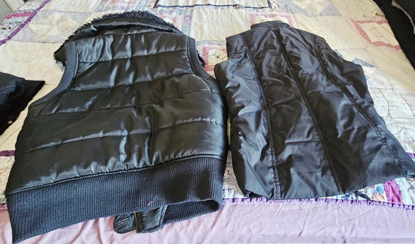 Two black puffer vests for women. One vest has a faux fur collar and buckle details. Both are size medium. These vests are perfect for layering on cooler days.