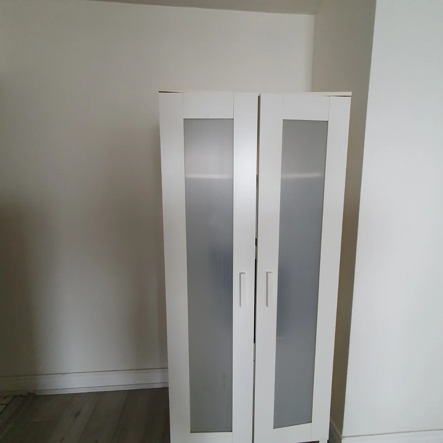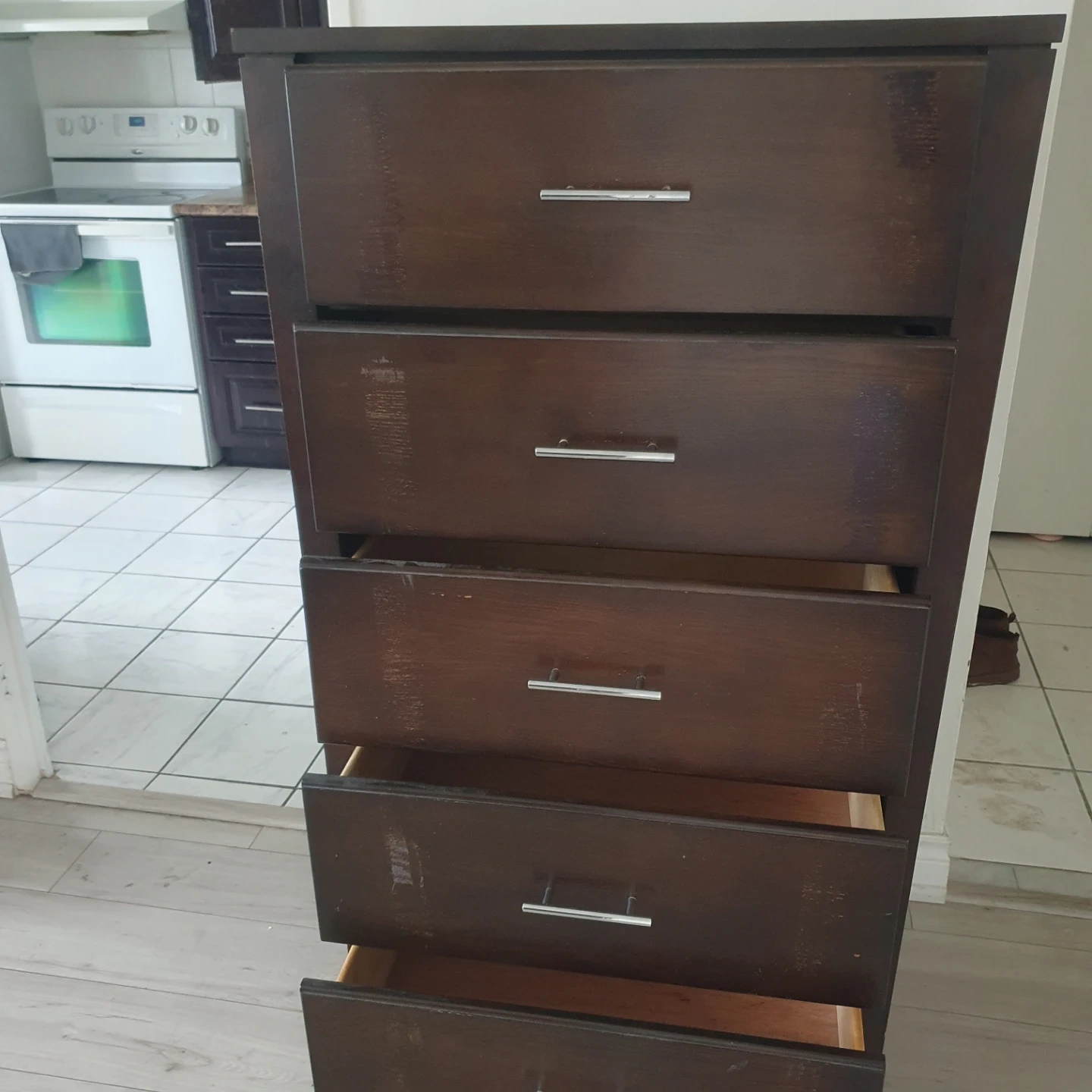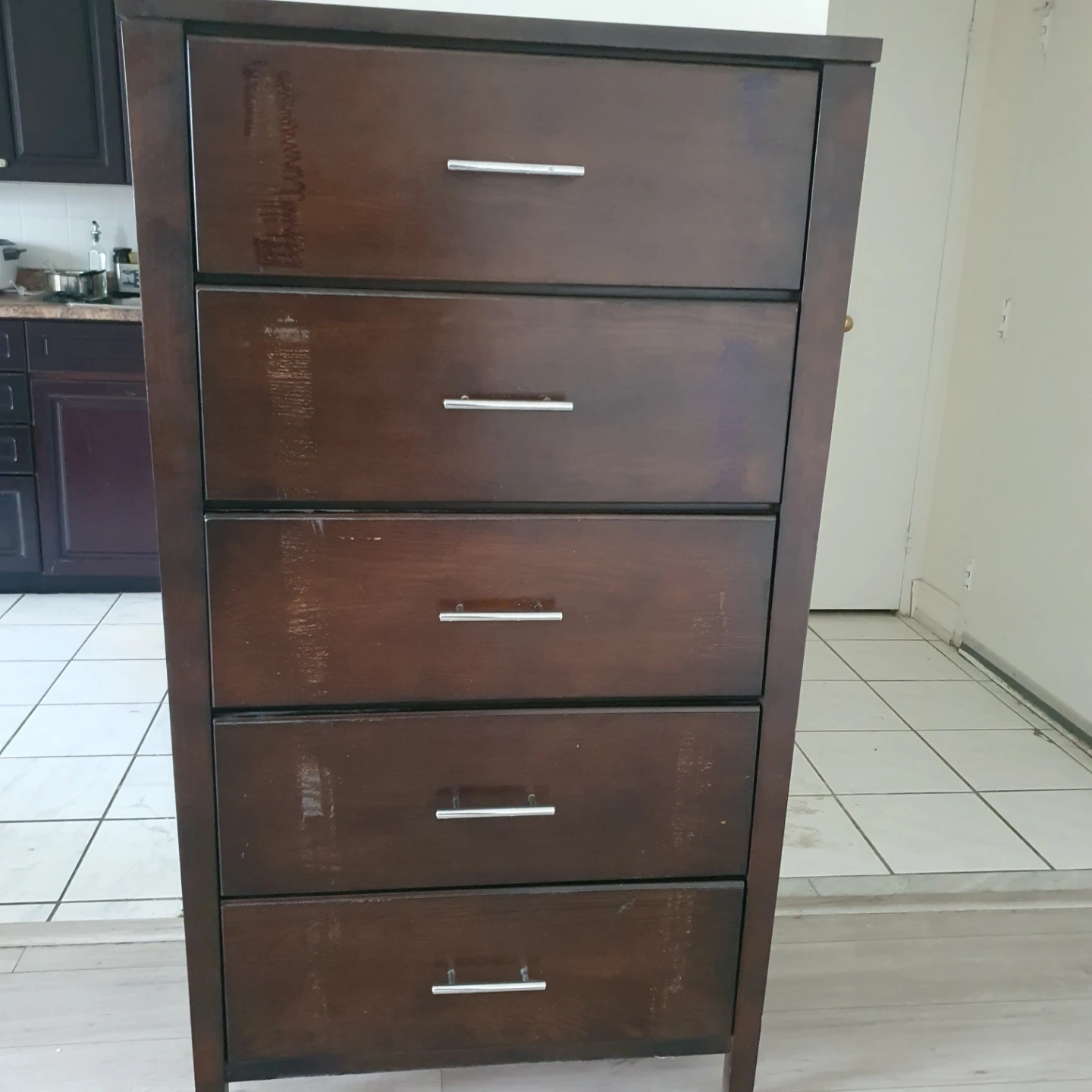 A dark brown dresser with five drawers. It's a nice piece for organizing clothes. Around 5 feet tall and also white closet.