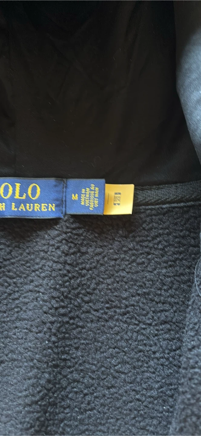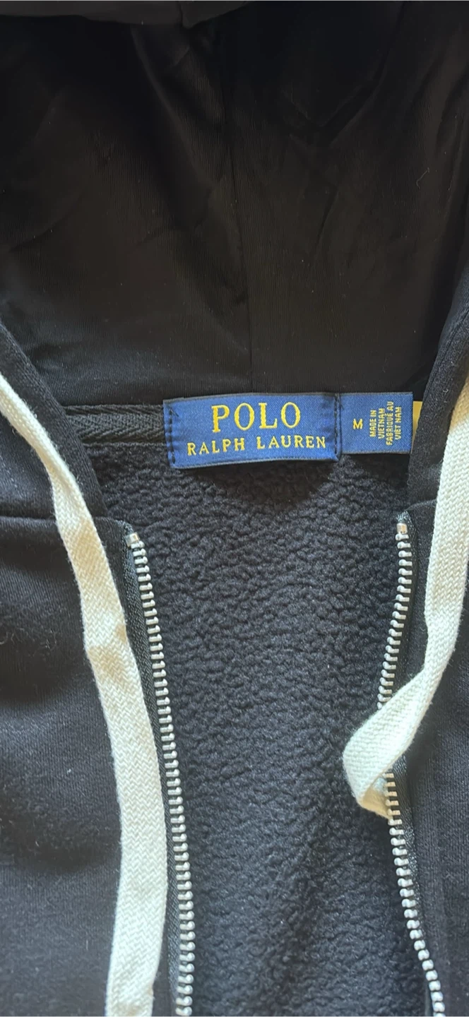 This is a black zip-up hoodie from Polo Ralph Lauren. It's a size medium and features a fleece lining for extra warmth. A classic choice for casual wear!