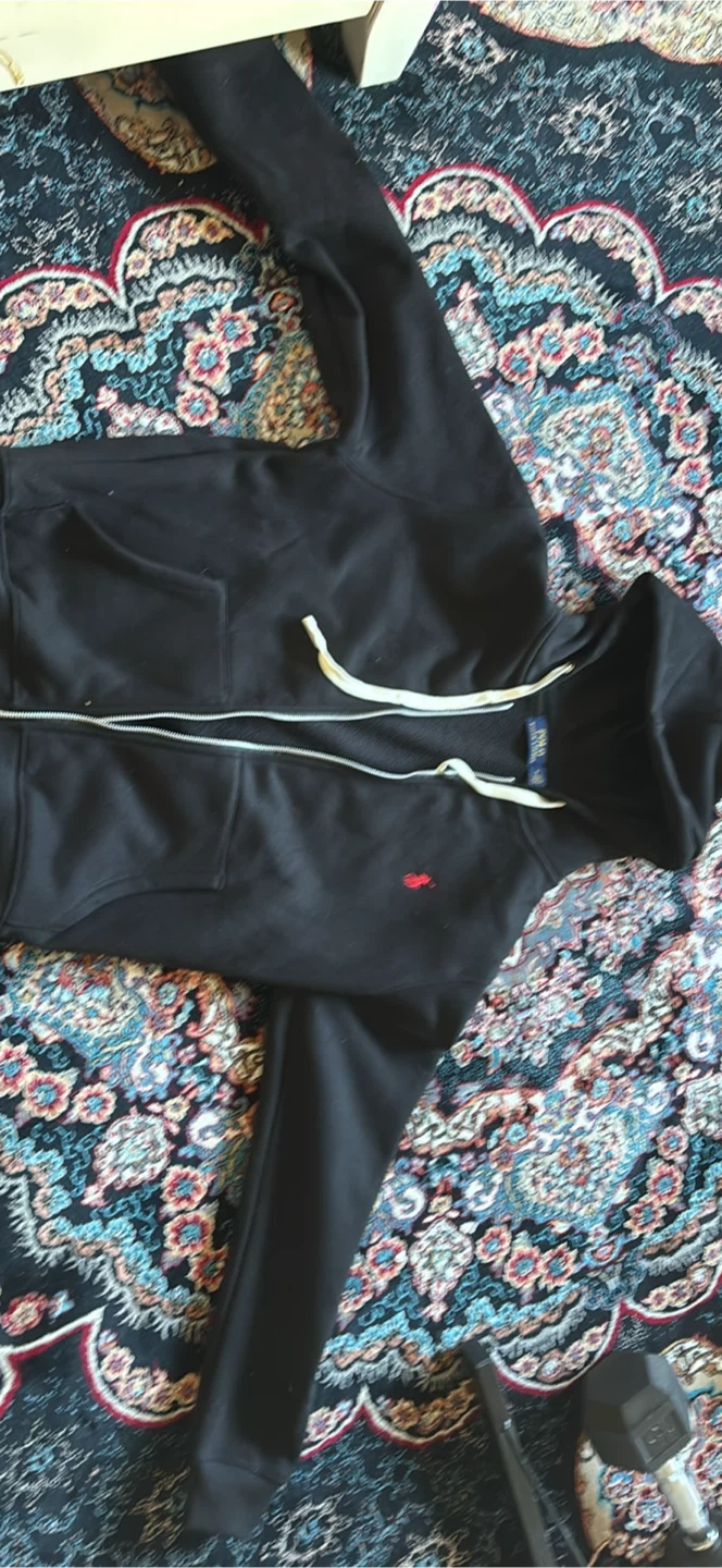 This is a black zip-up hoodie from Polo Ralph Lauren. It's a size medium and features a fleece lining for extra warmth. A classic choice for casual wear!