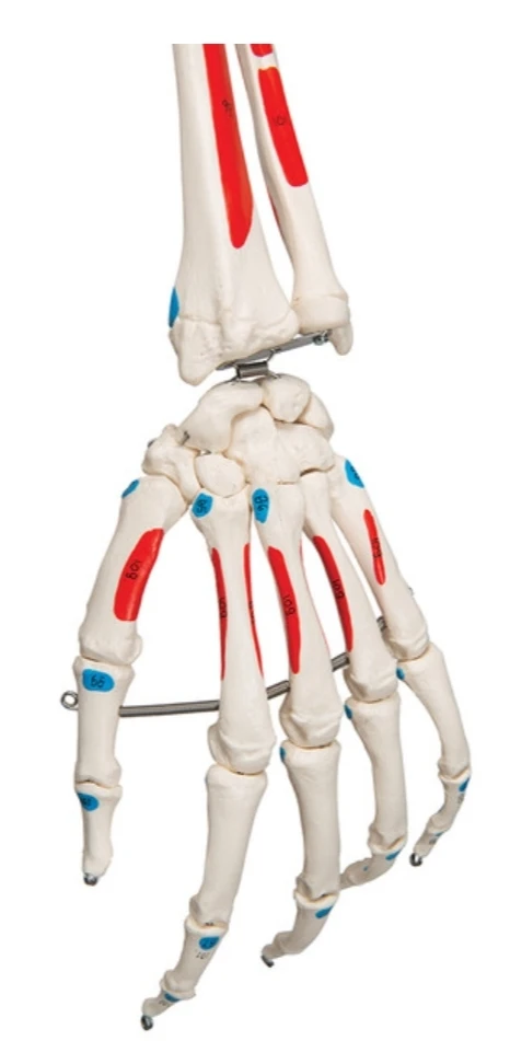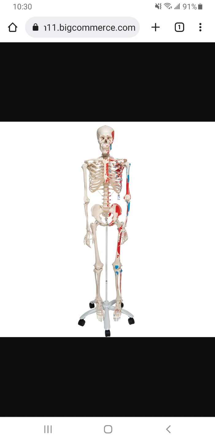 This is an anatomical model of the human skeleton, featuring coloured muscle origins and insertions. It's mounted on a stand with wheels for easy movement. The skeleton is a detailed representation for educational or display purposes.