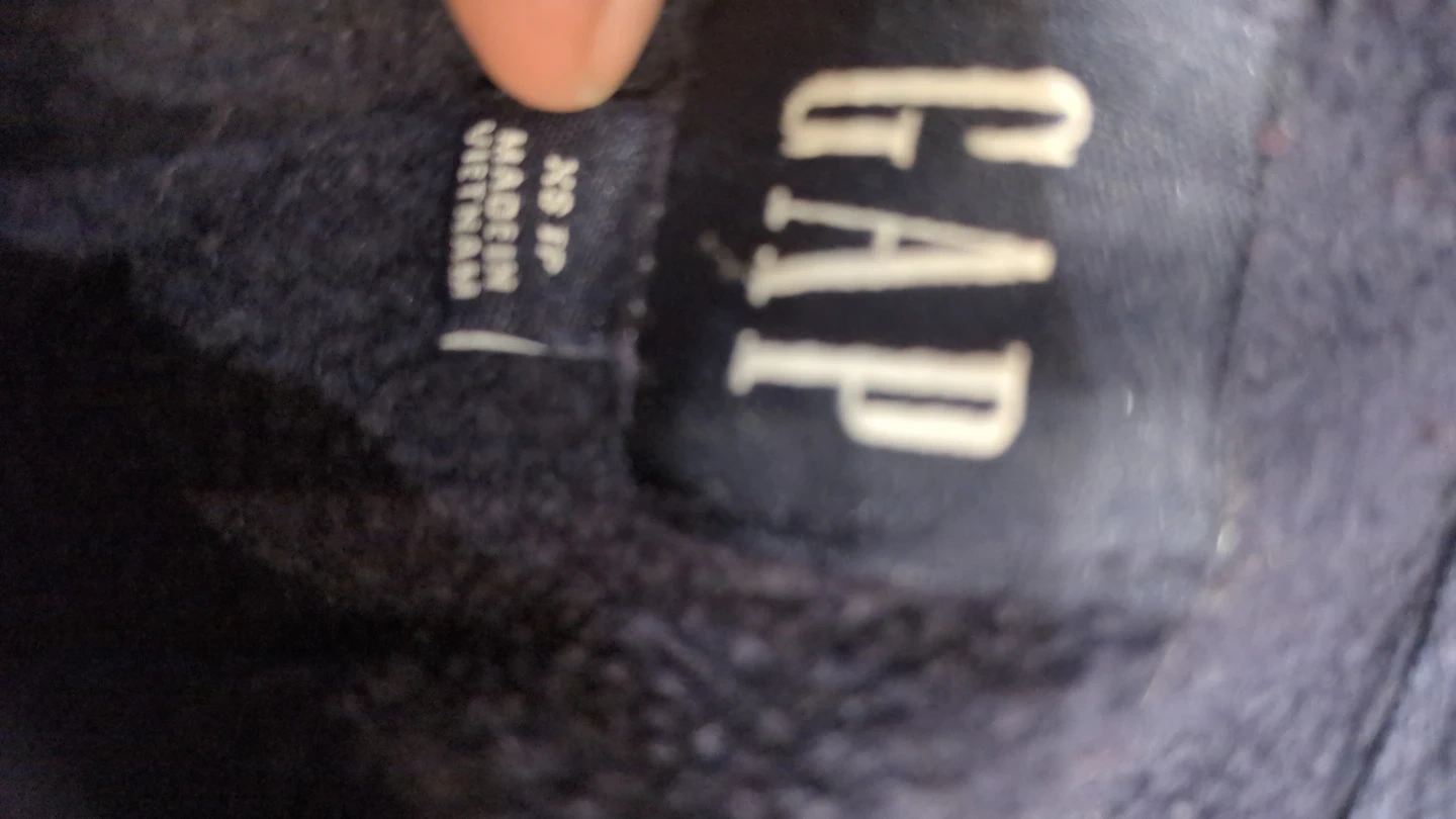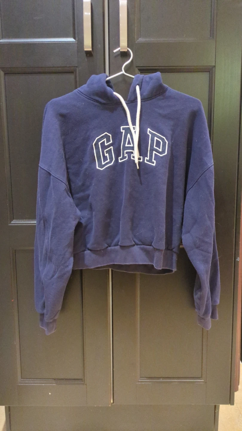 A navy blue cropped hoodie from GAP. It's a size XS. This hoodie features the classic GAP logo across the chest.