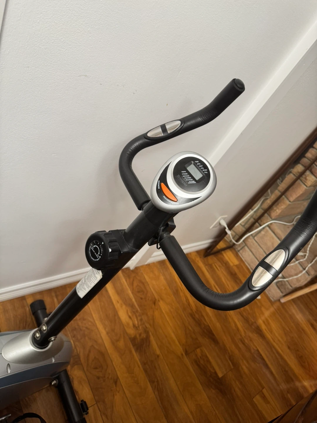 This is a stationary exercise bike with an adjustable resistance knob. It features a digital display that shows your workout stats. The seat is adjustable for comfort.