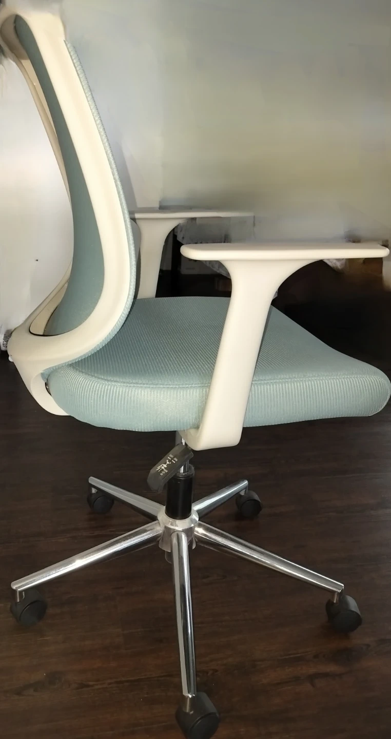 Selling a light green office chair. It's in great condition and ready for a new workspace! The chair features a comfortable seat and back, plus adjustable height.
