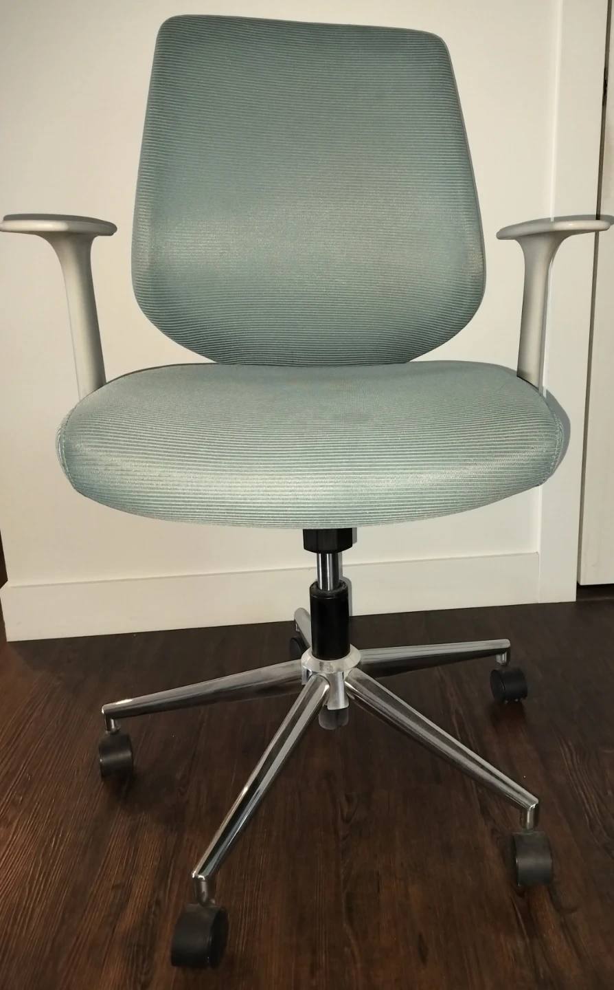 Selling a light green office chair. It's in great condition and ready for a new workspace! The chair features a comfortable seat and back, plus adjustable height.