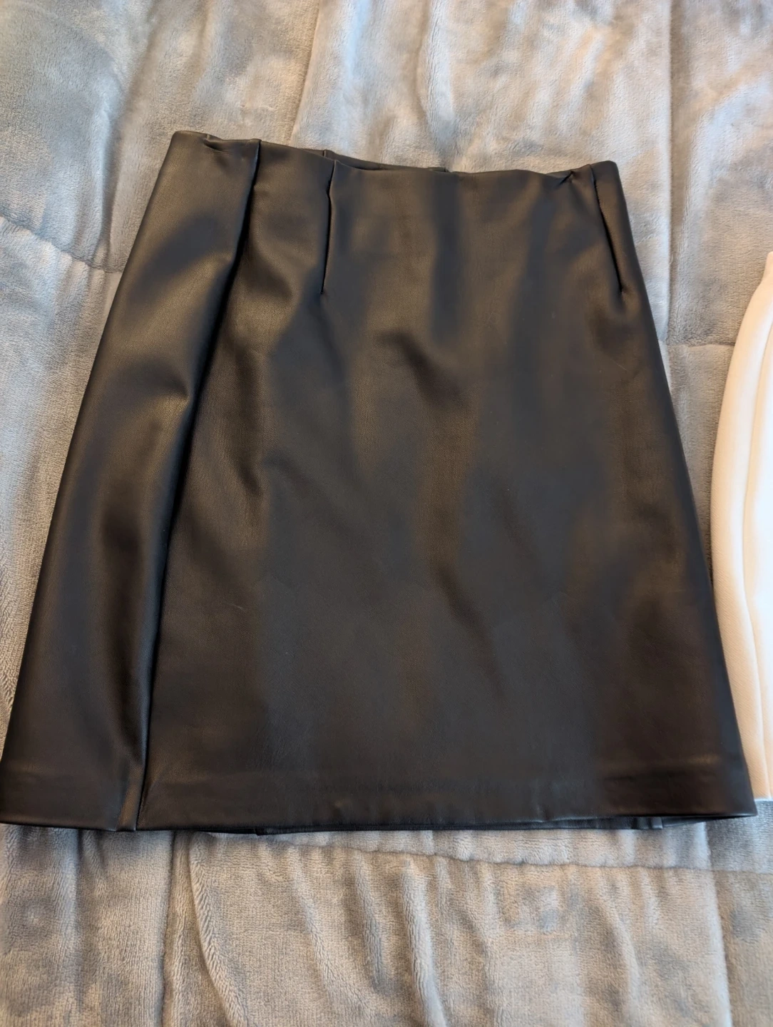 This is a black faux leather mini skirt. It features a flattering A-line silhouette with subtle pleating detail at the front. Material is faux leather.