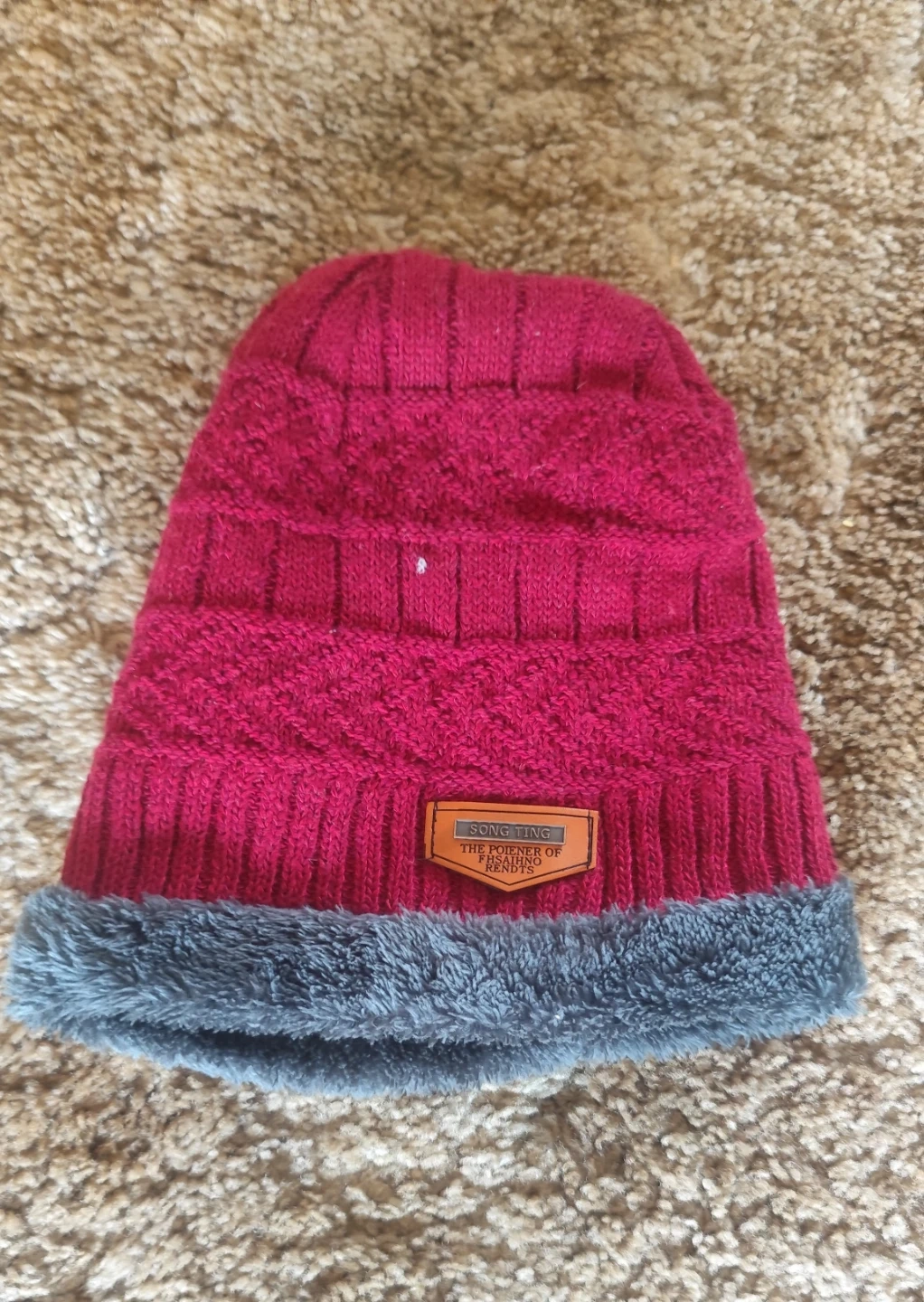 This SONG TING beanie is a cozy red colour with a soft grey fleece lining. It's made with a textured knit pattern. Perfect for keeping warm on chilly days!
