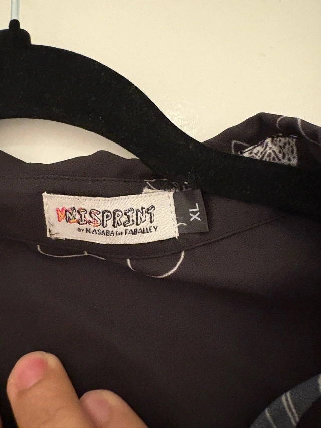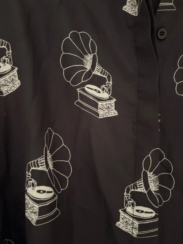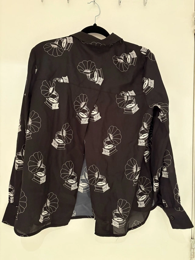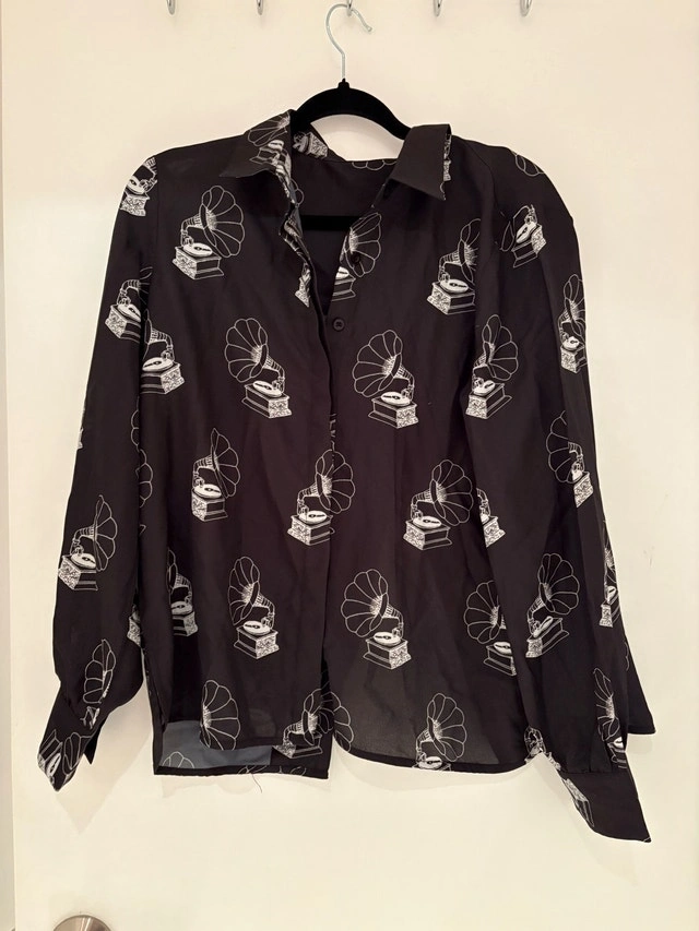 Stylish button down shirt by Masaba Gupta. Features a unique gramophone print. Perfect for casual or formal wear. Never worn. Pick up at King and Portland. Cash only.