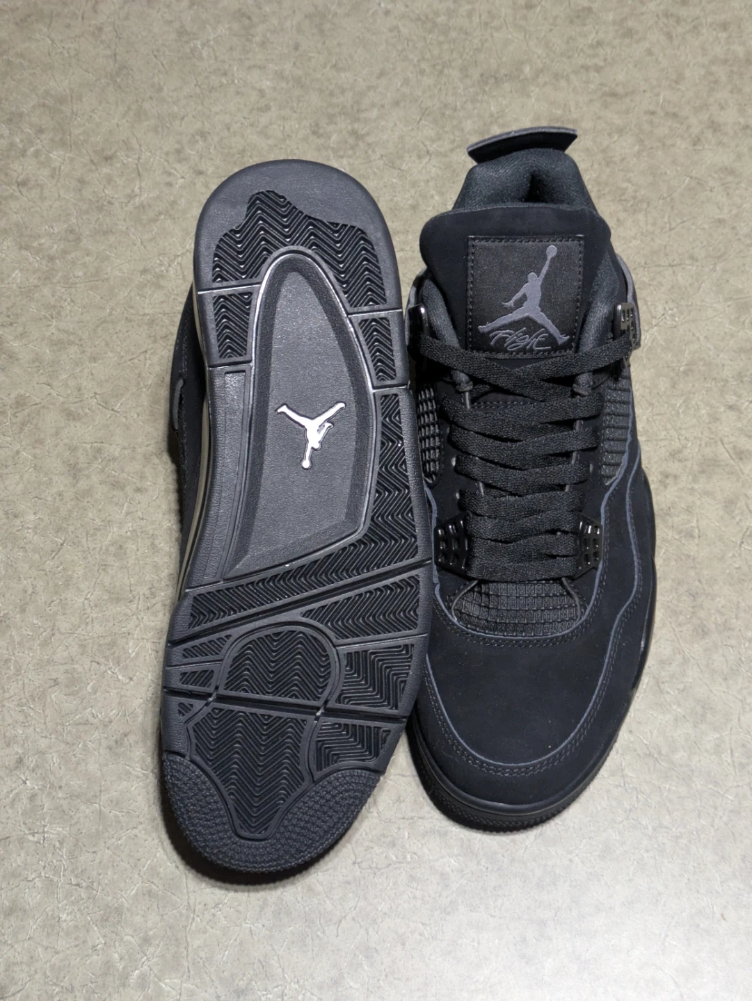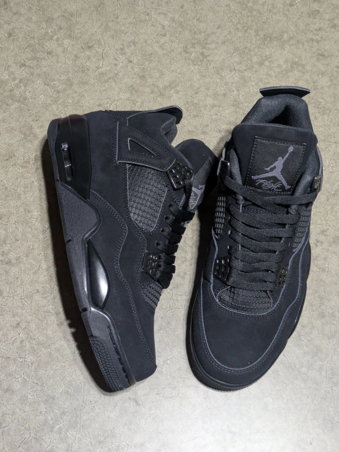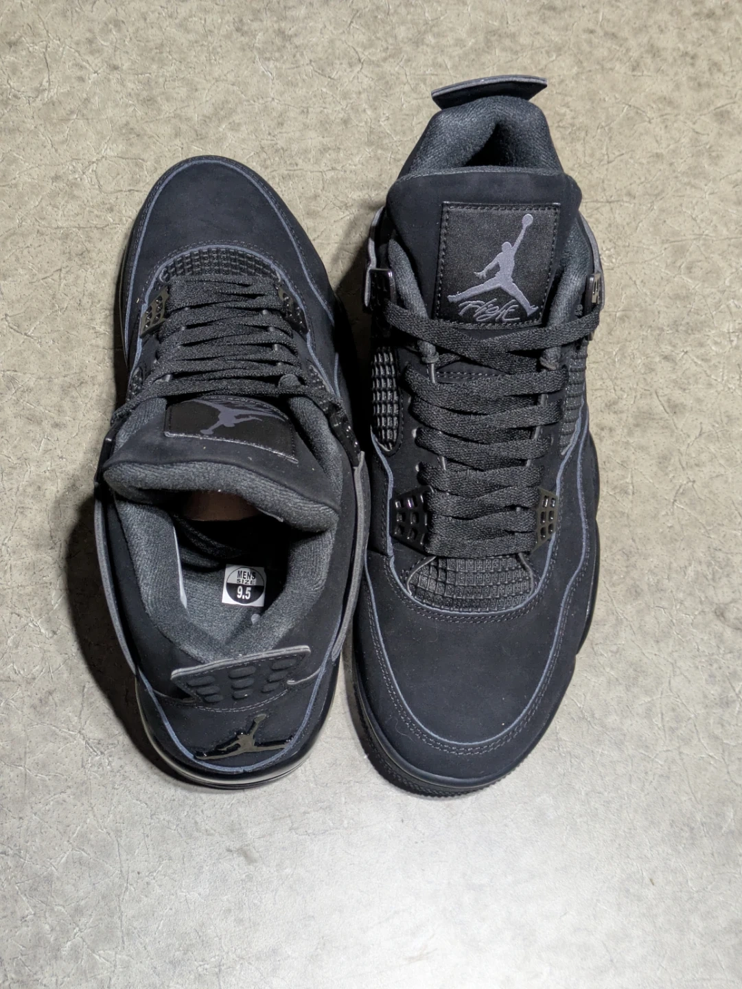 Air Jordan 4 Retro sneakers in a black colourway. Men's size 9.5. These shoes feature a durable design for everyday wear.