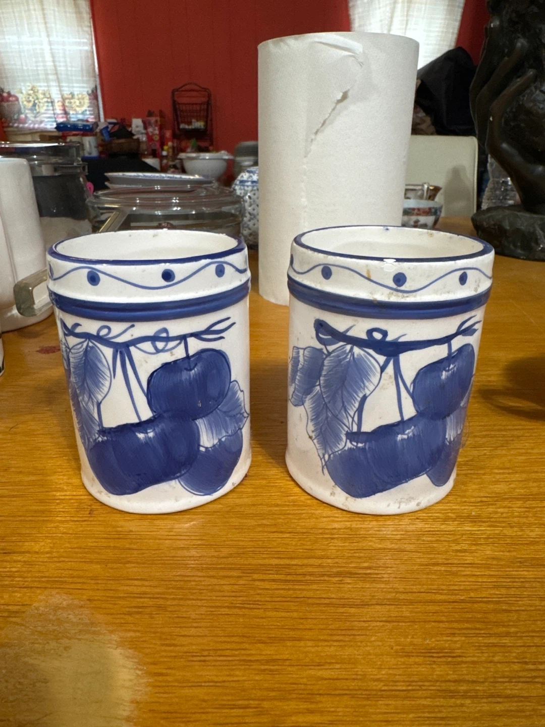 Set of 2 Antique Ceramic Canisters with Blue Cherry Design