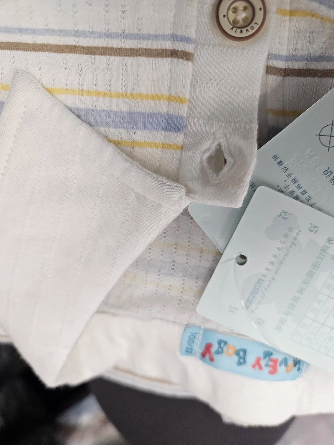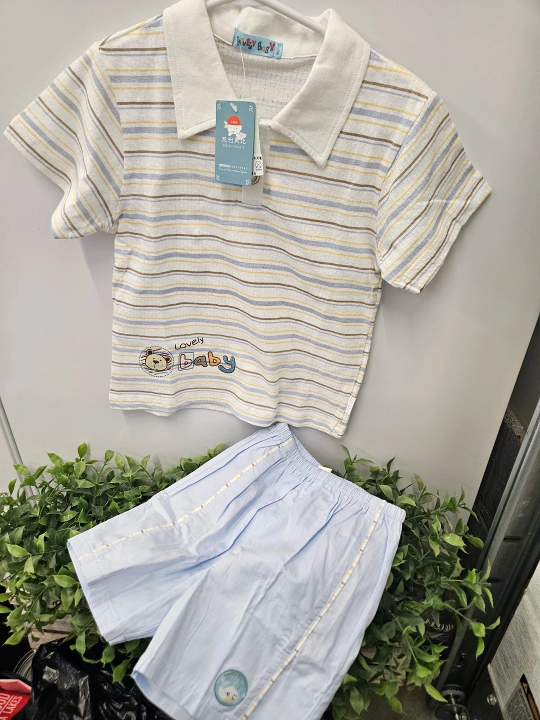 This is a cute striped polo shirt and shorts set from Lovely Baby. The shirt has a collar and button closure. The shorts are light blue with a drawstring waist. It's made of a soft, breathable fabric perfect for warm weather. This set would be great for everyday wear or special occasions.
