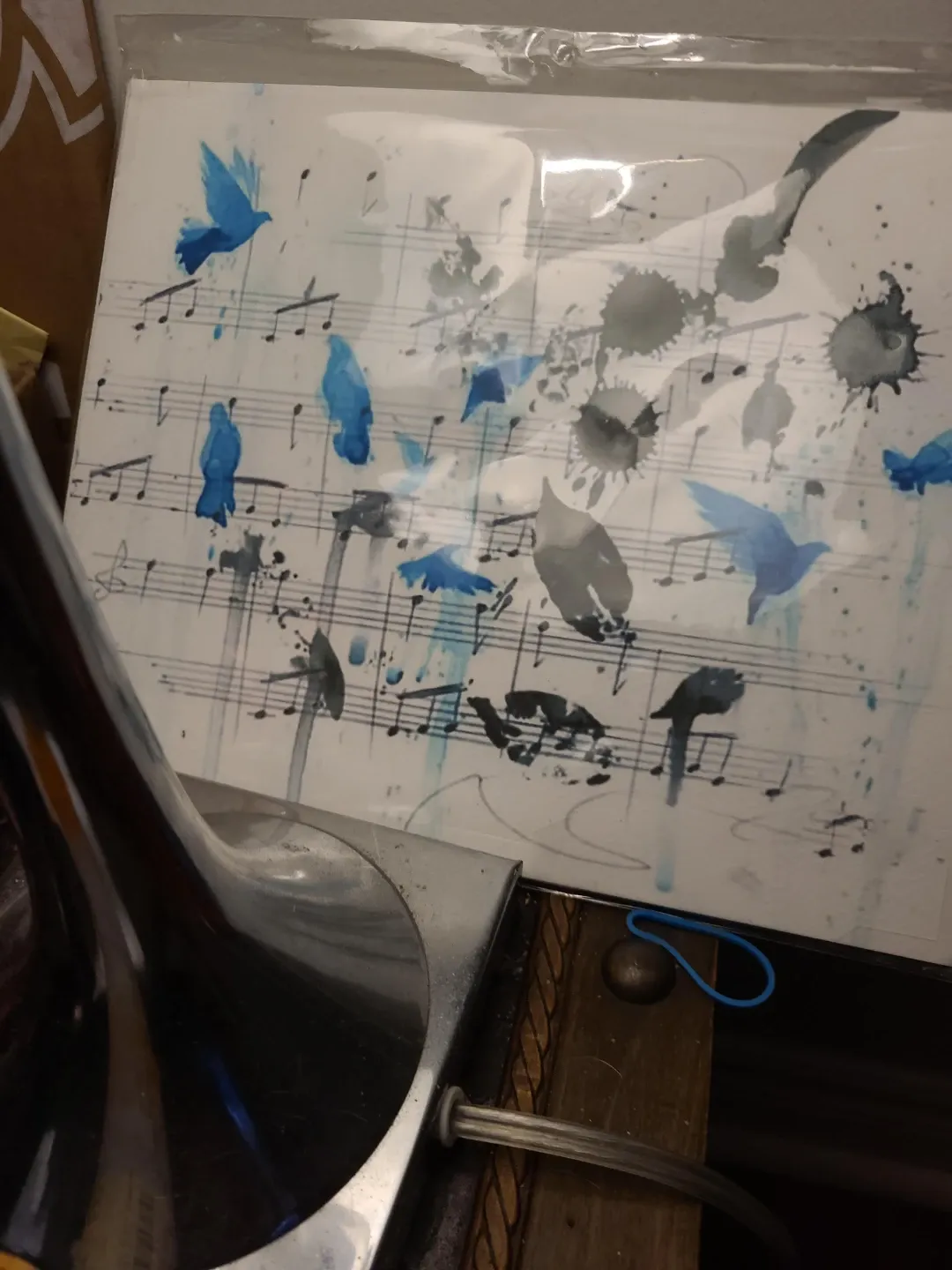 A decorative art print featuring musical notes and stylized blue birds. The design includes ink splatters and watercolour effects. It's printed on paper and is suitable for framing.