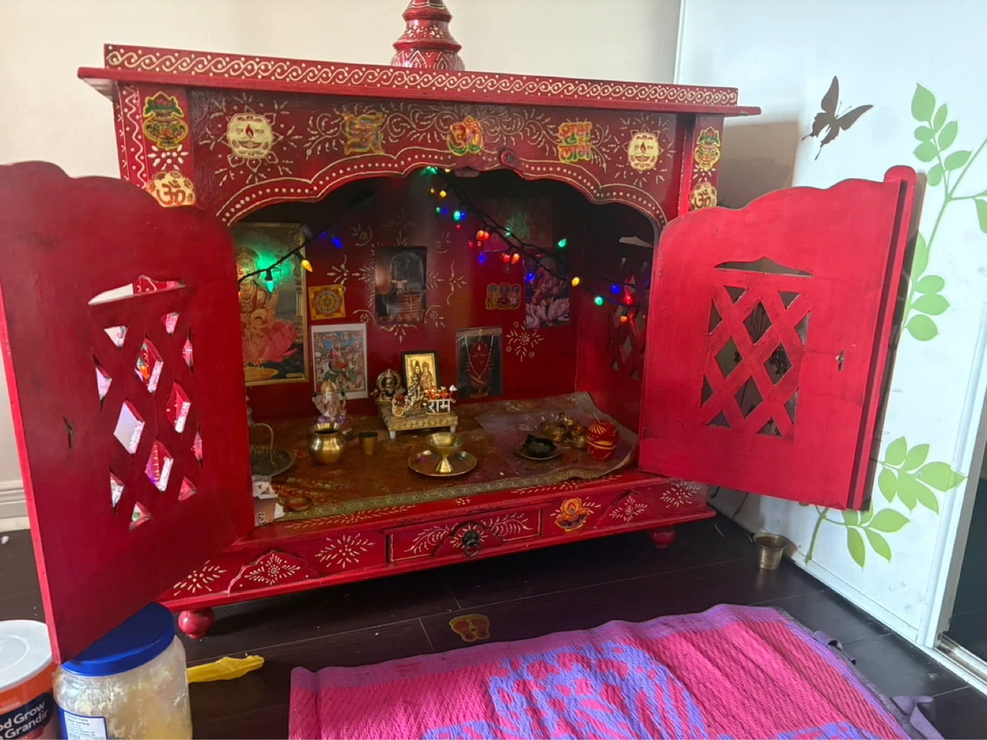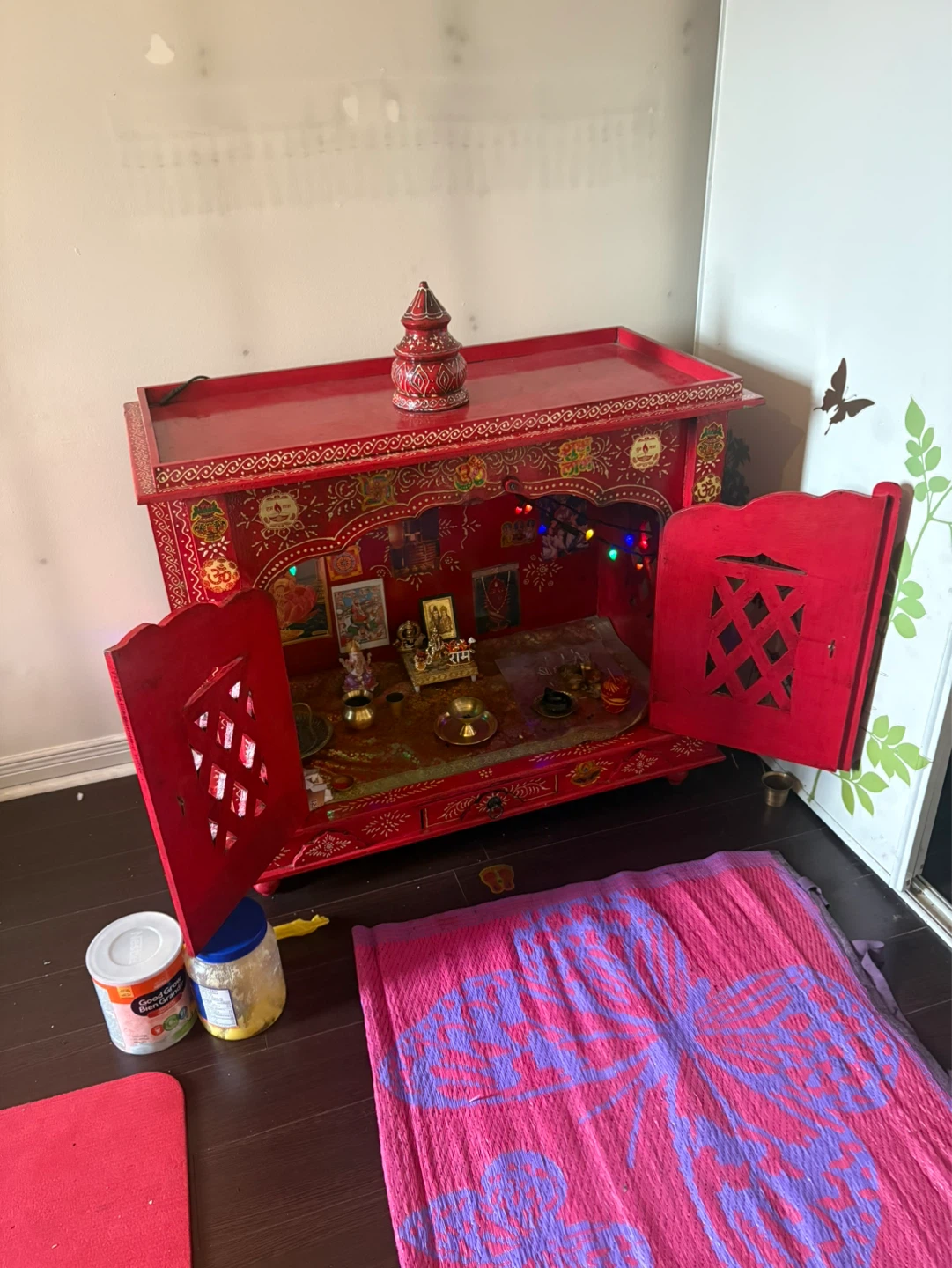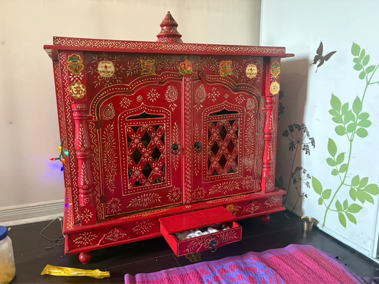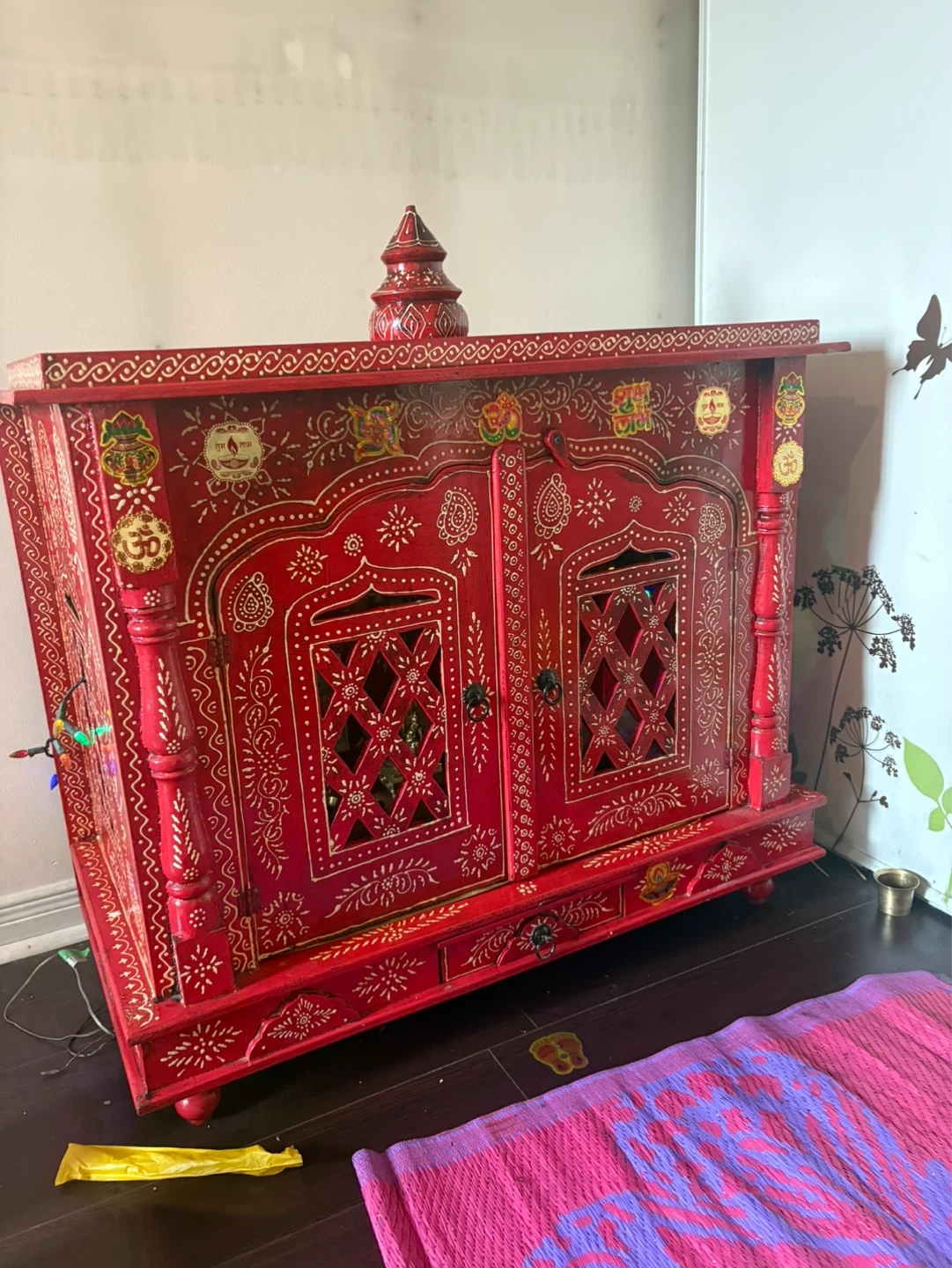 A vibrant red, hand-painted wooden pooja mandir, perfect for home worship. It features decorative carvings. Includes a small pull-out drawer at the bottom for storage. Made of wood.