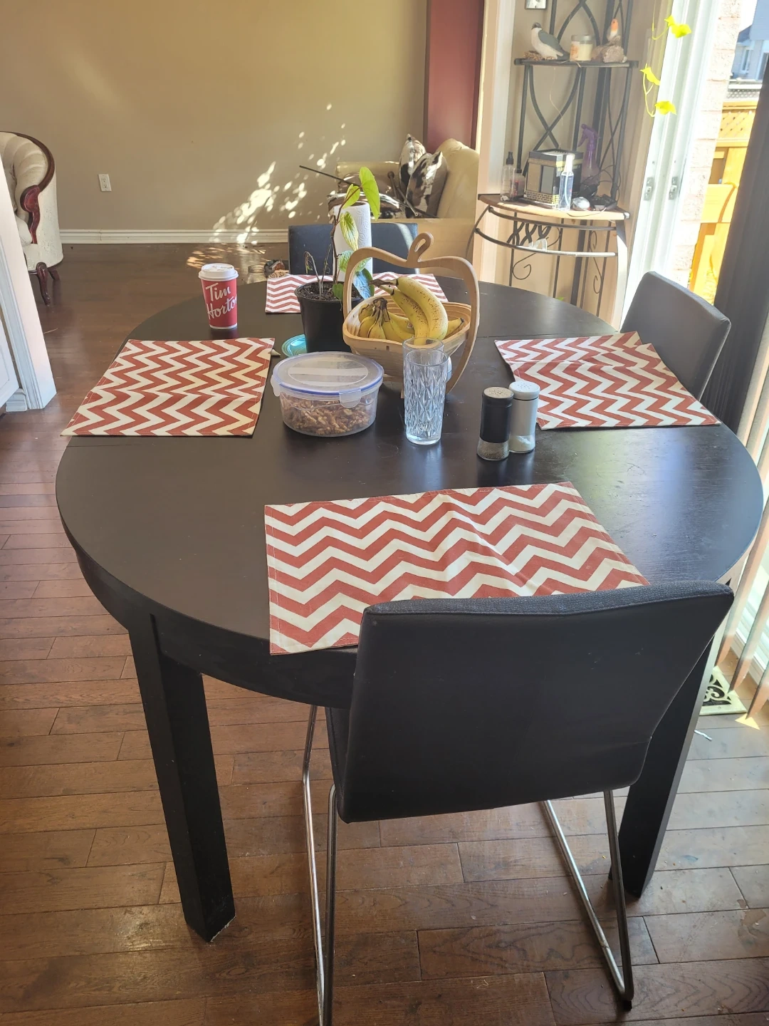 This is a round dark wood dining table. It comes with four black chairs with metal legs. Four red and white chevron patterned placemats are included. Perfect for a cozy dining space!