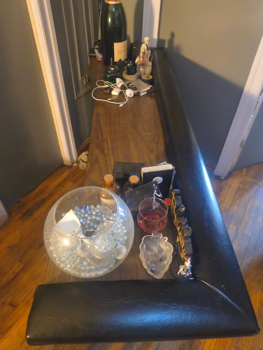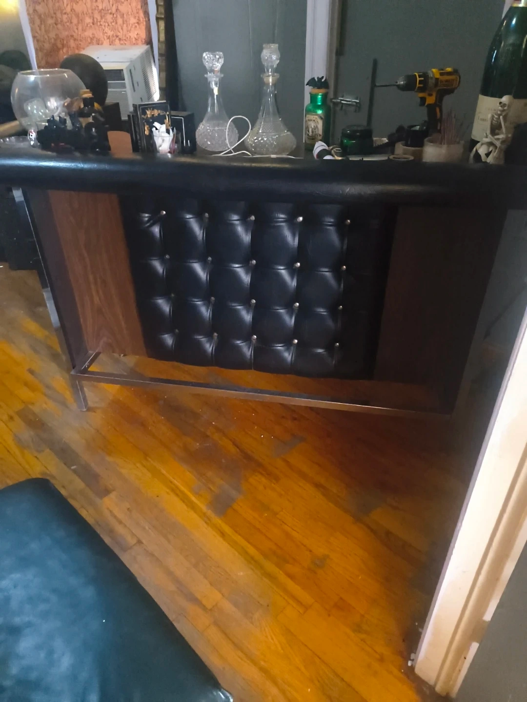 This bar unit features a tufted black faux leather front panel and a dark wood grain finish. It includes a metal footrest and open shelving on the back. Its classic design is perfect for a home entertainment space. Dimensions are approximately 42" tall, 48" wide, and 20" deep.