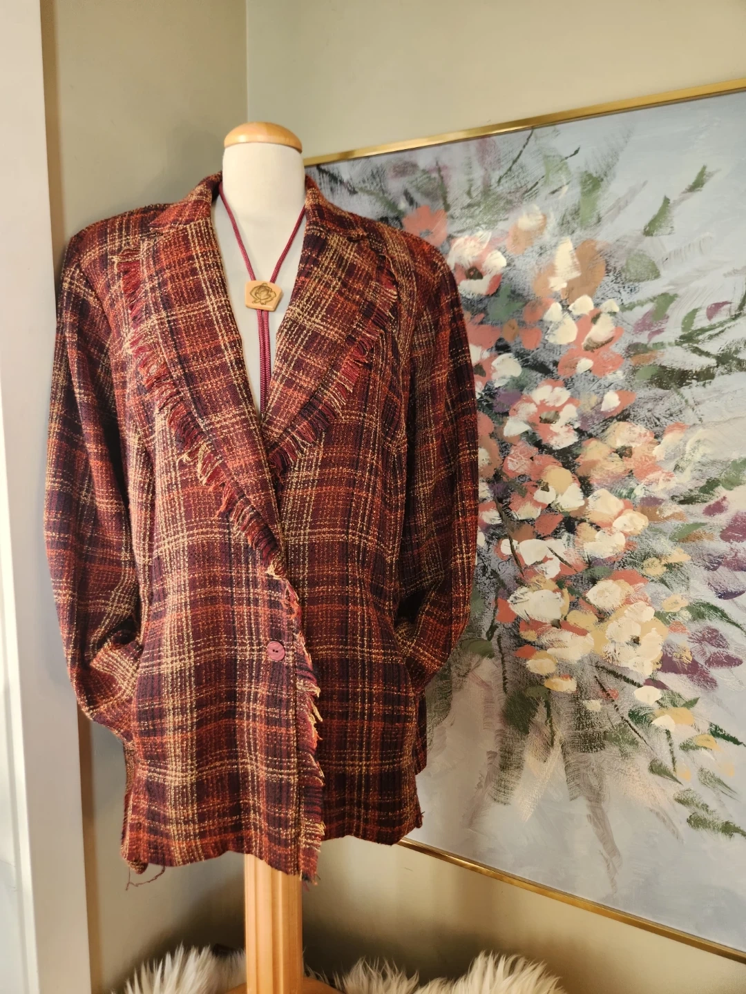 One of Jackie's favorite 1990s blazers! Chic light weight tweed jacket features a classic plaid pattern. This vintage size 20 blazer is perfect with jeans, dress pants or skirts! It has a stylish fringed trim and has convenient Pockets.