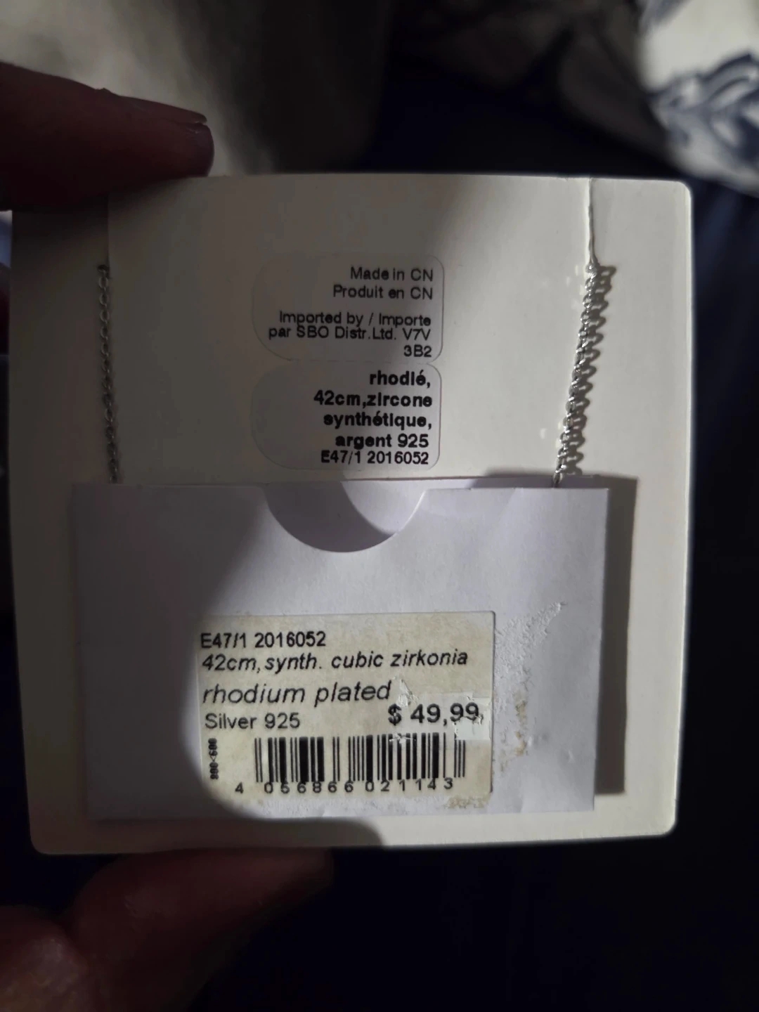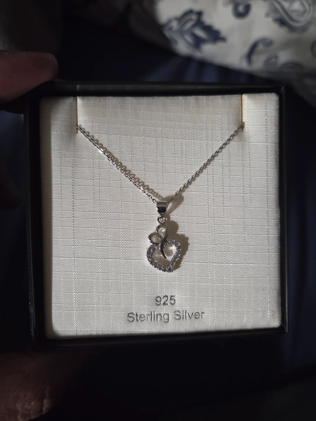 This is a rhodium plated sterling silver 925 necklace. It's adorned with cubic zirconia stones and features a chain length of 42cm. The pendant has a heart design with a small charm. It comes in its original box.