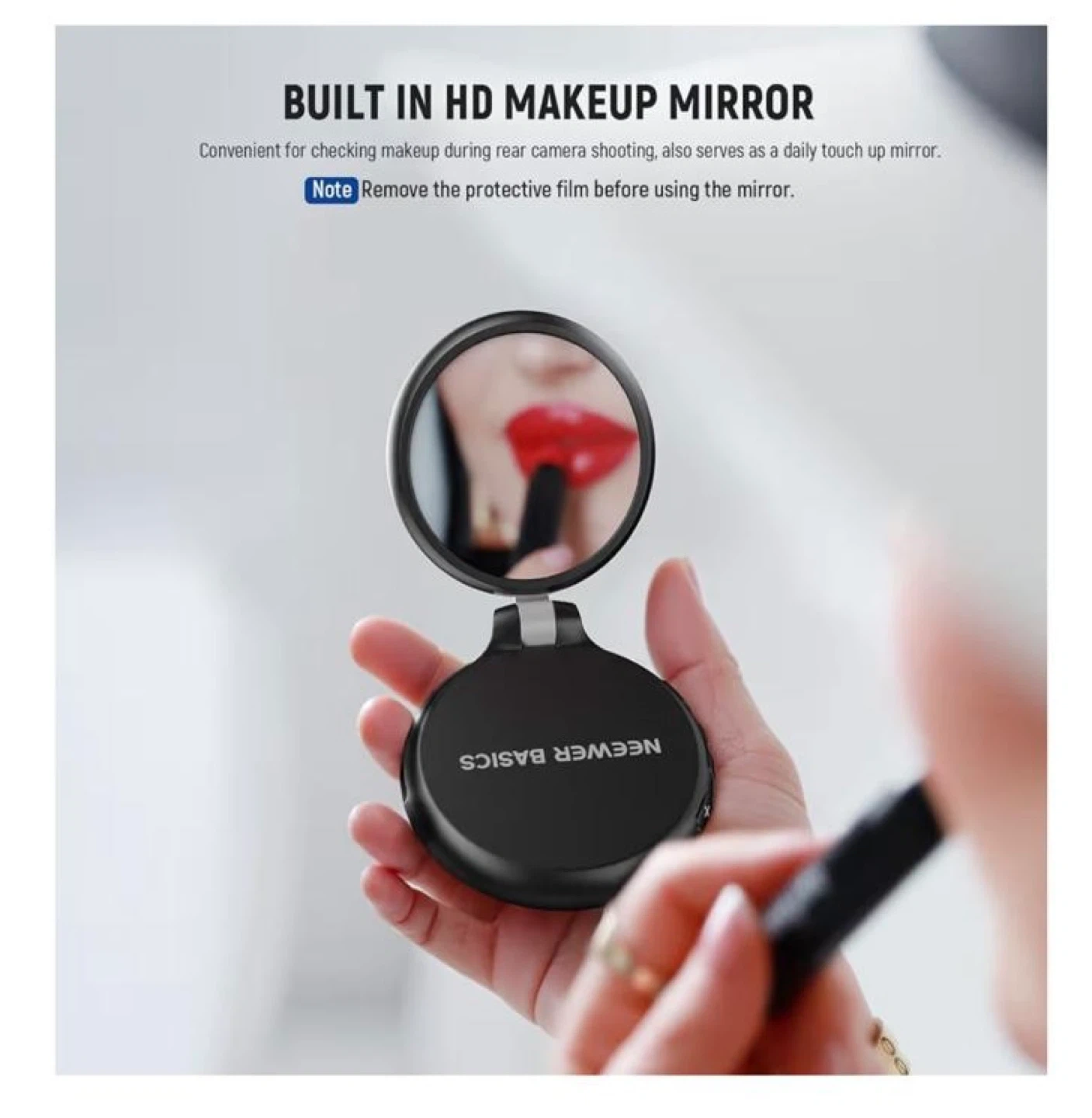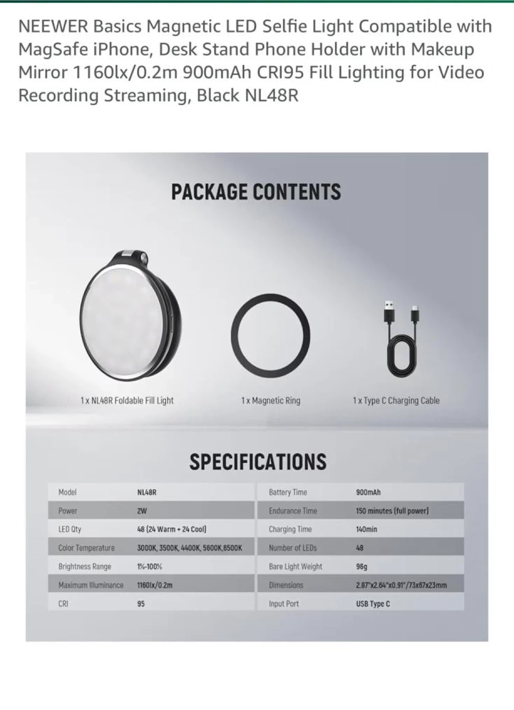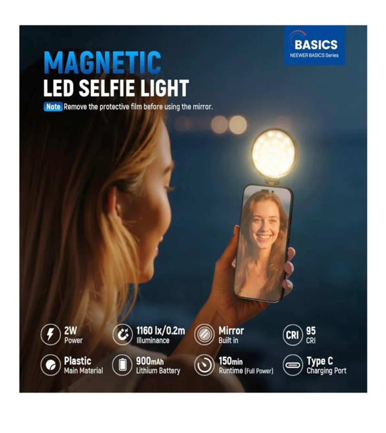 This is a NEEWER Basics magnetic LED selfie light. It's easy to use anytime, anywhere! It has a built-in HD makeup mirror and can be used as a phone stand. The light has 5 colour temperatures and a 1-100% brightness range. It also features: