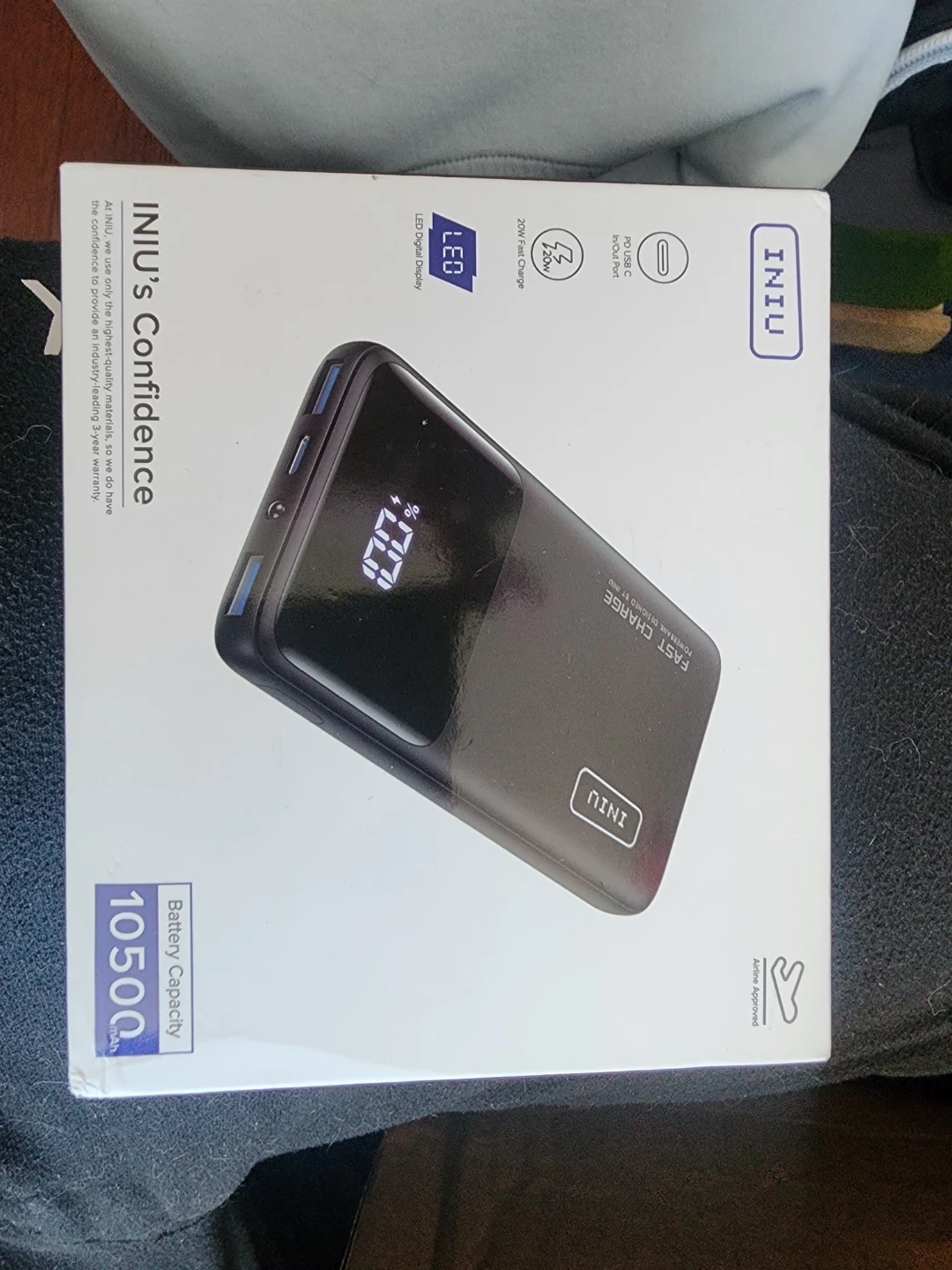 This Iniu power bank has a 10500mAh battery capacity and a digital display. It features fast charging and a built-in LED flashlight. Includes USB-C and USB-A ports.