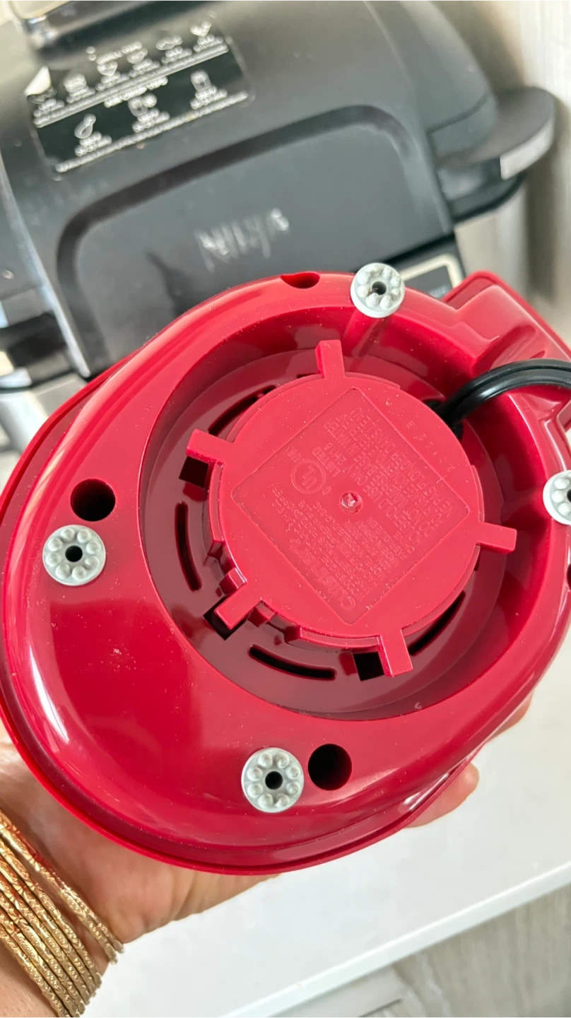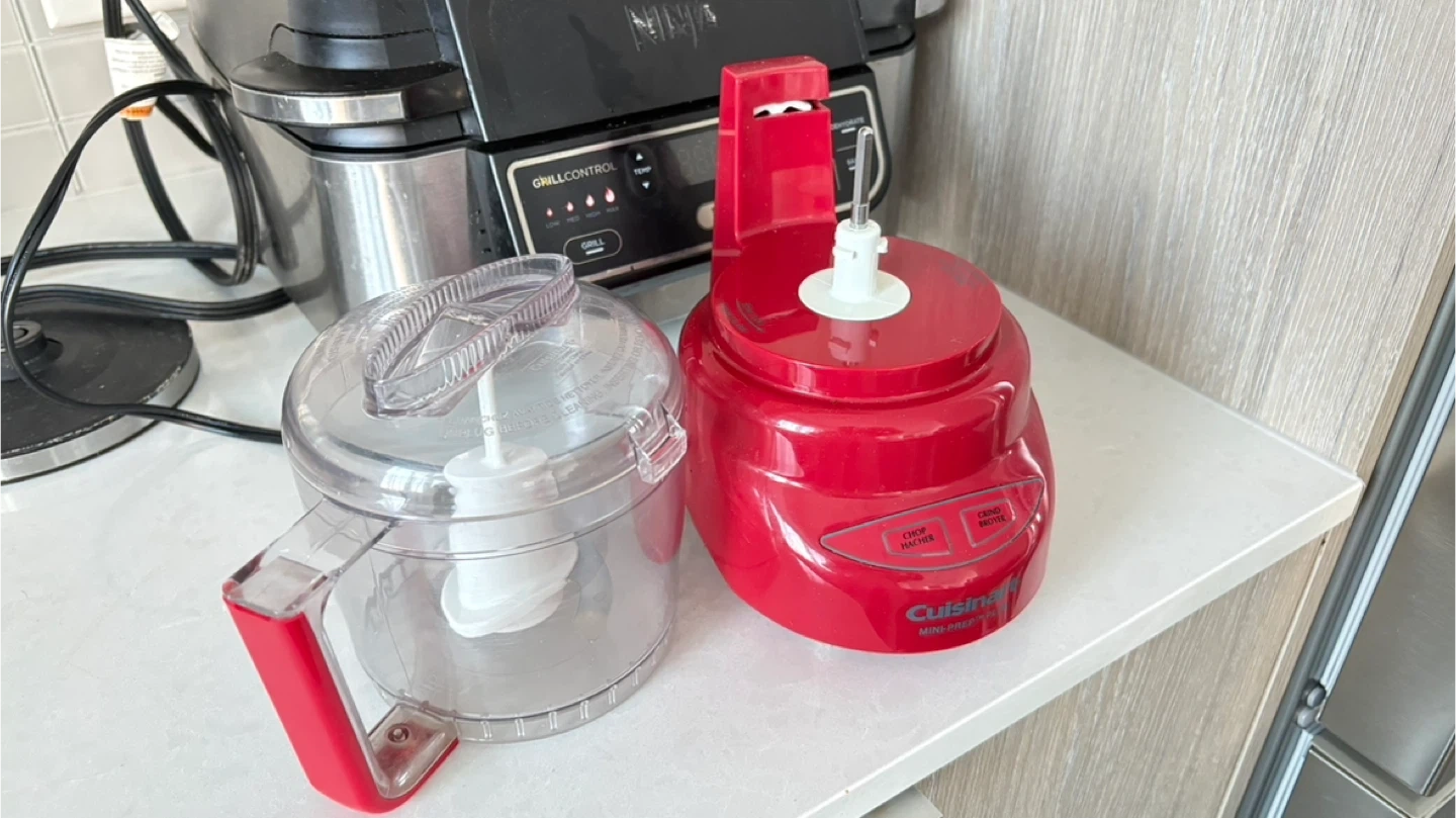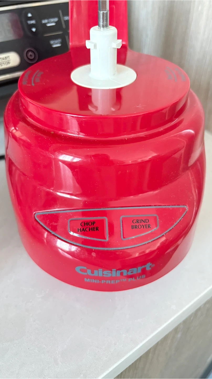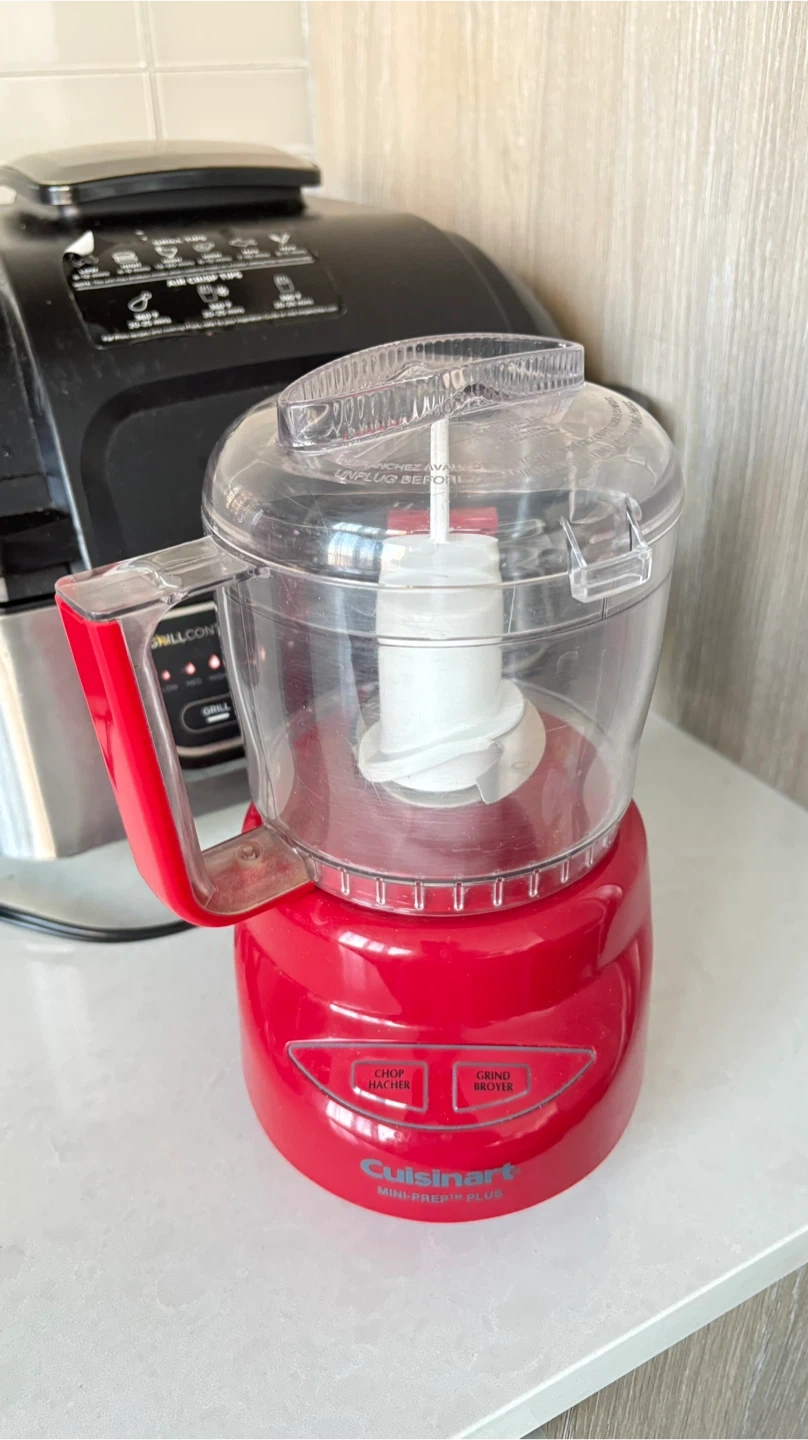 This is a red Cuisinart Mini-Prep Plus food processor. It's compact and perfect for chopping herbs or grinding small ingredients. Features buttons for 'Chop/Hacher' and 'Grind/Broier'.