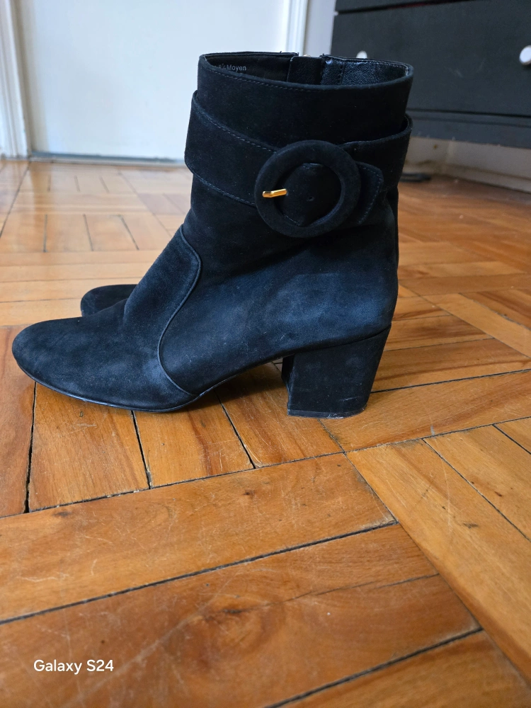 Women's black suede ankle boots. Block heel. Zip closure. Buckle accent. Size: (Please check the pictures for size information). Gently used.