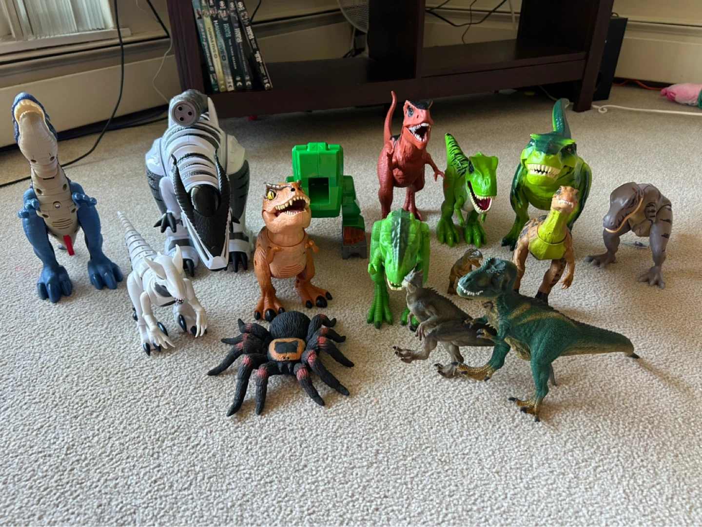 Collection of various dinosaur and one spider toy figures. Includes a blue velociraptor, a white raptor, a zebra-striped robotic dino, an orange T-Rex, several green dinosaurs, and a large brown dinosaur figure. These toys are great for imaginative play.