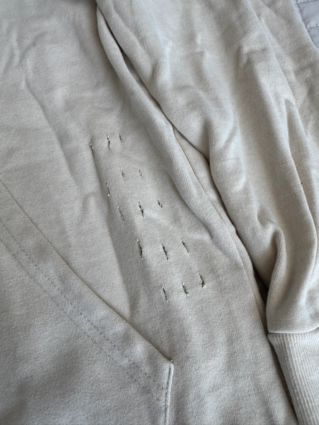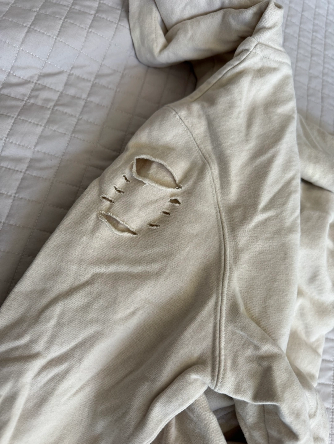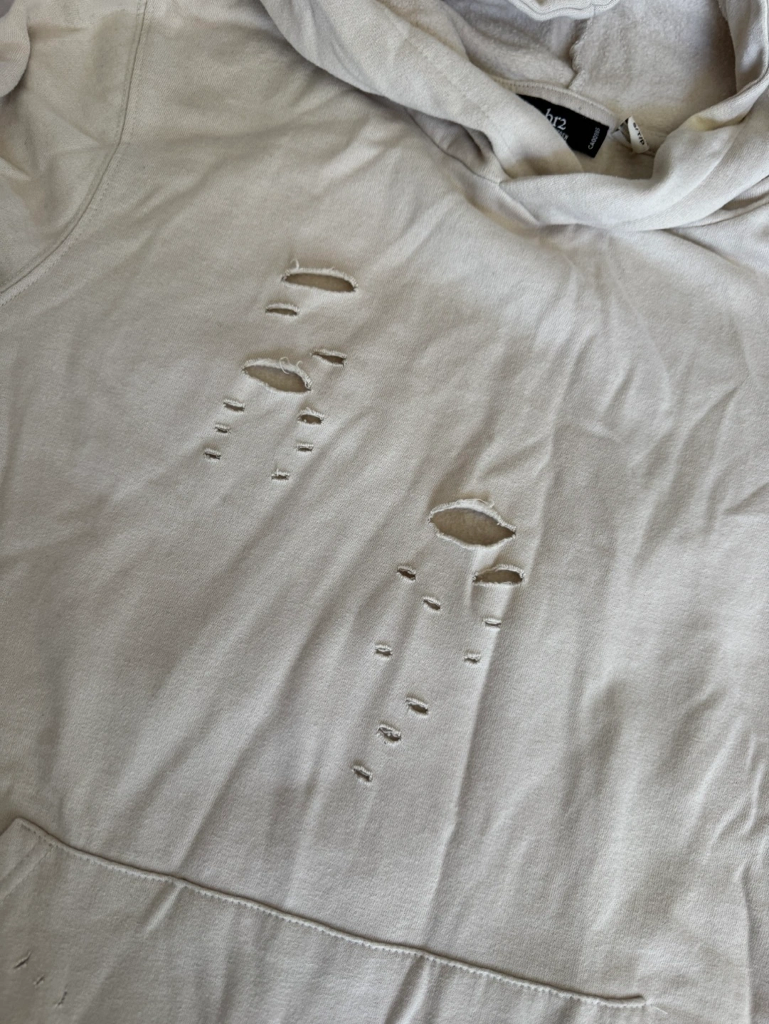 Cream-coloured hoodie. Features intentional distressing and a kangaroo pocket. Long sleeves. Relaxed fit. 9/10 condition Pick