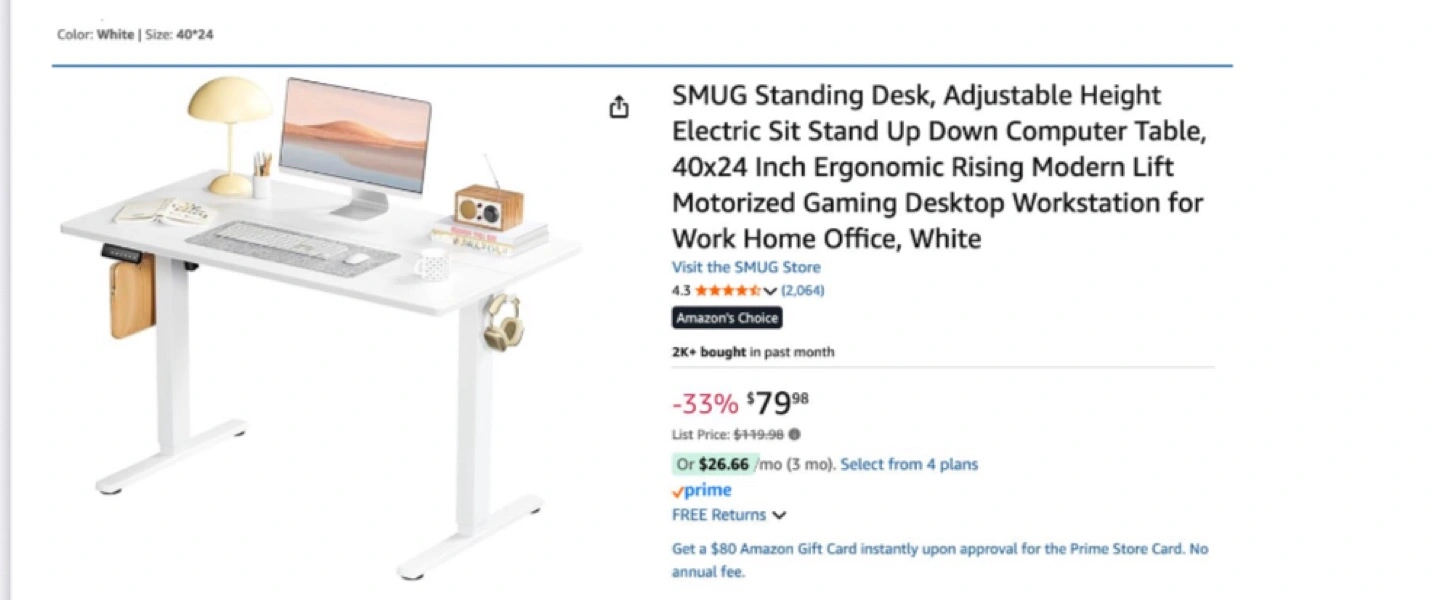 Selling a SMUG standing desk in white. It features an adjustable height, so you can use it as a sit-stand desk. Dimensions are 40x24 inches. It's in great condition and ready for a new home!