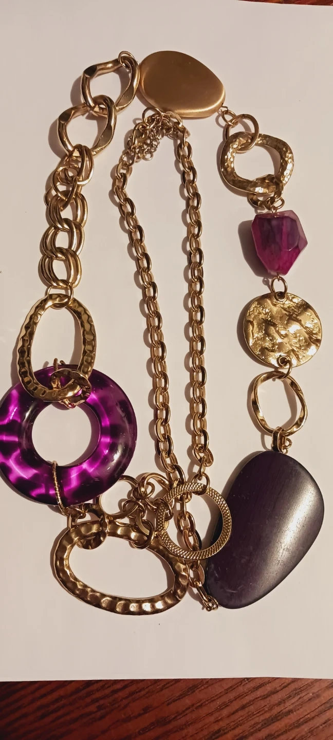 New !! This statement necklace features a gold-tone chain with mixed textures and purple accents. It includes a large purple ring, a faceted purple stone, and a dark oval bead. The varying chain links and decorative elements create a unique, eye-catching design. This piece adds a pop of color and bold style to any outfit! 36" long. New !! ALL MY PRICES ARE NEGOTIABLE !!