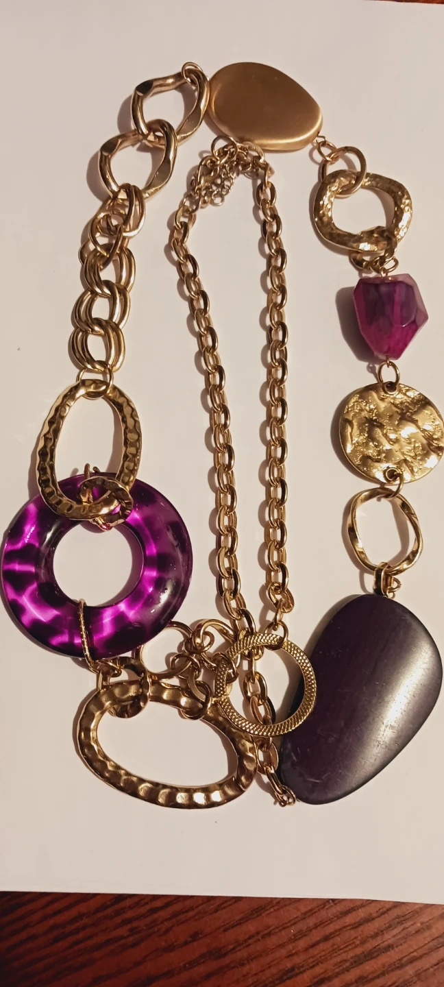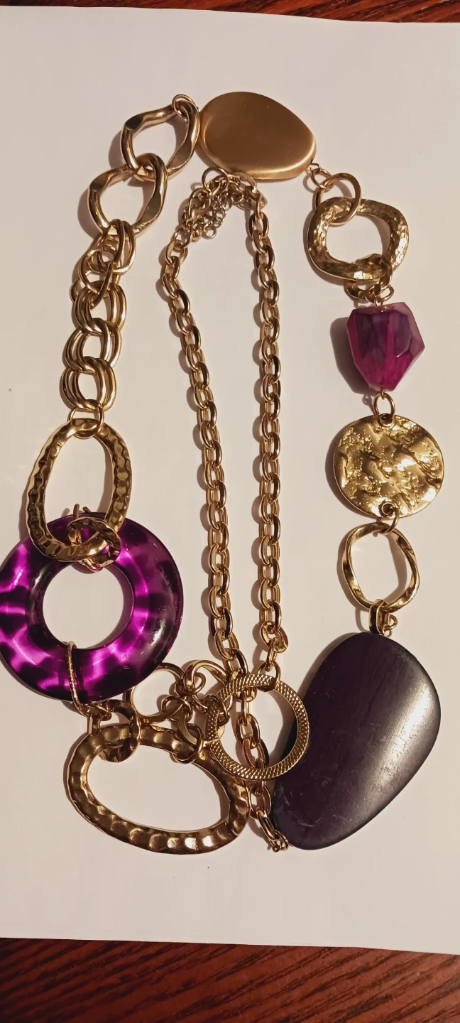 New !! This statement necklace features a gold-tone chain with mixed textures and purple accents. It includes a large purple ring, a faceted purple stone, and a dark oval bead. The varying chain links and decorative elements create a unique, eye-catching design. This piece adds a pop of color and bold style to any outfit! 36" long. New !! ALL MY PRICES ARE NEGOTIABLE !!