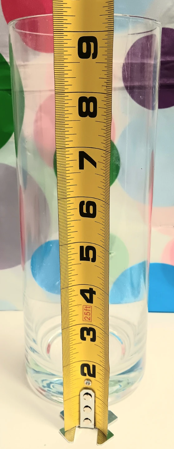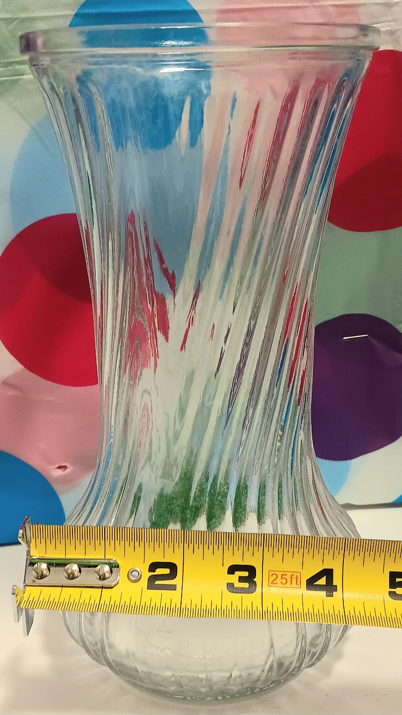 This pair of glass vases includes one cylindrical vase approximately 9 inches tall with a 3.25 inch diameter, and one decorative, fluted vase approximately 8 inches tall with a 4.5 inch diameter. These vases are in used condition, showing no signs of chips or cracks and are ready to display your favourite floral arrangement.