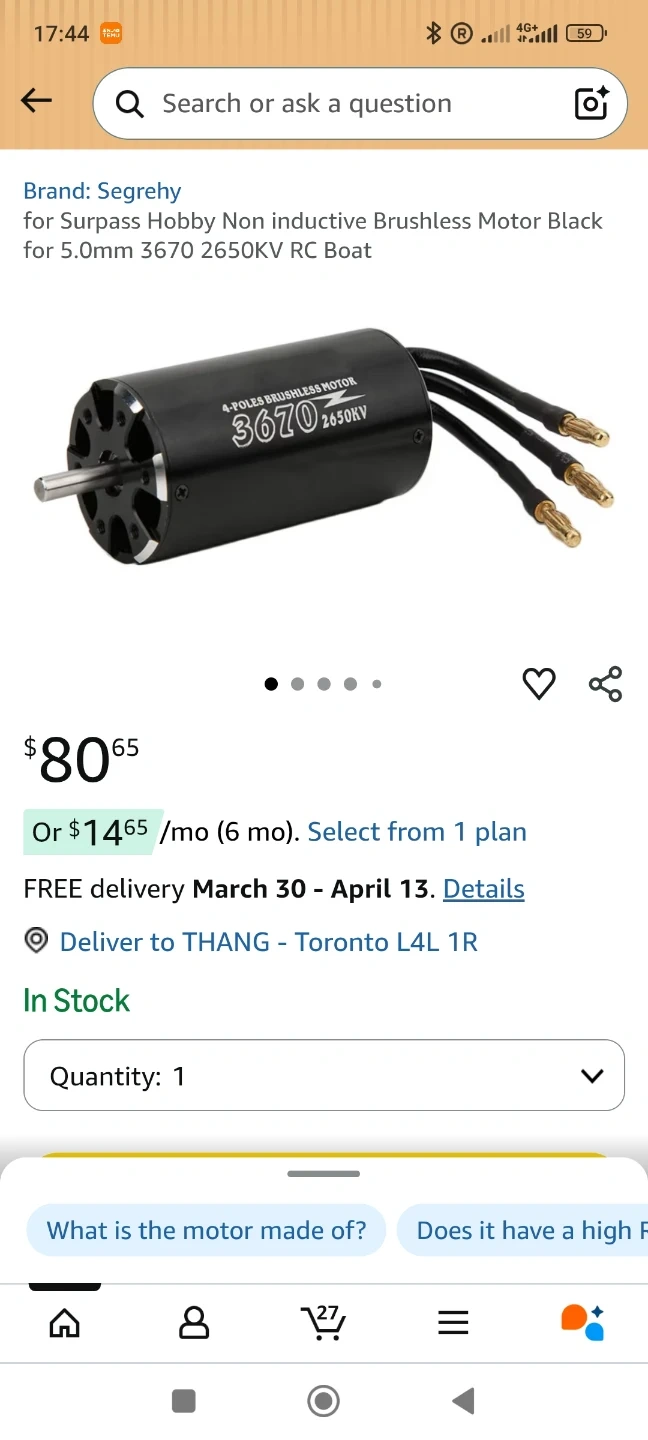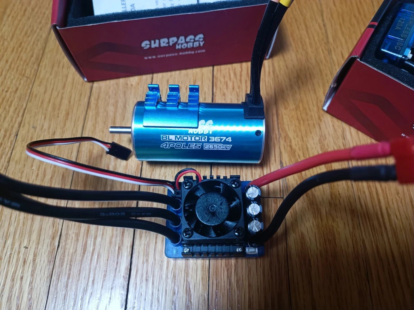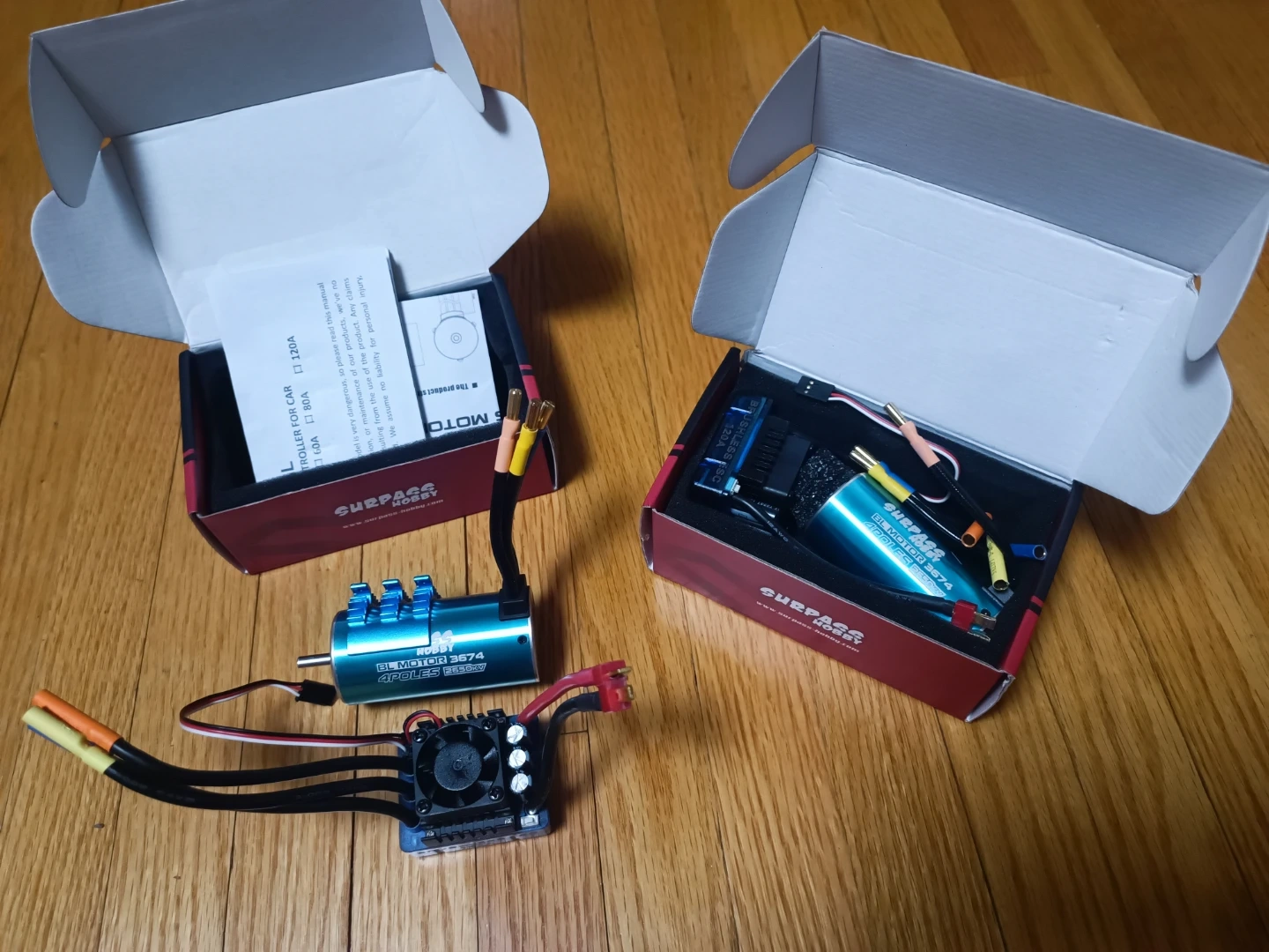 Selling a pair .This is a Surpass Hobby 3674 4-pole 2650KV brushless motor. It's blue and comes with necessary connectors. An ESC is included in the box as well. This motor is suitable for 1/8 and 1/10 RC cars and boats.