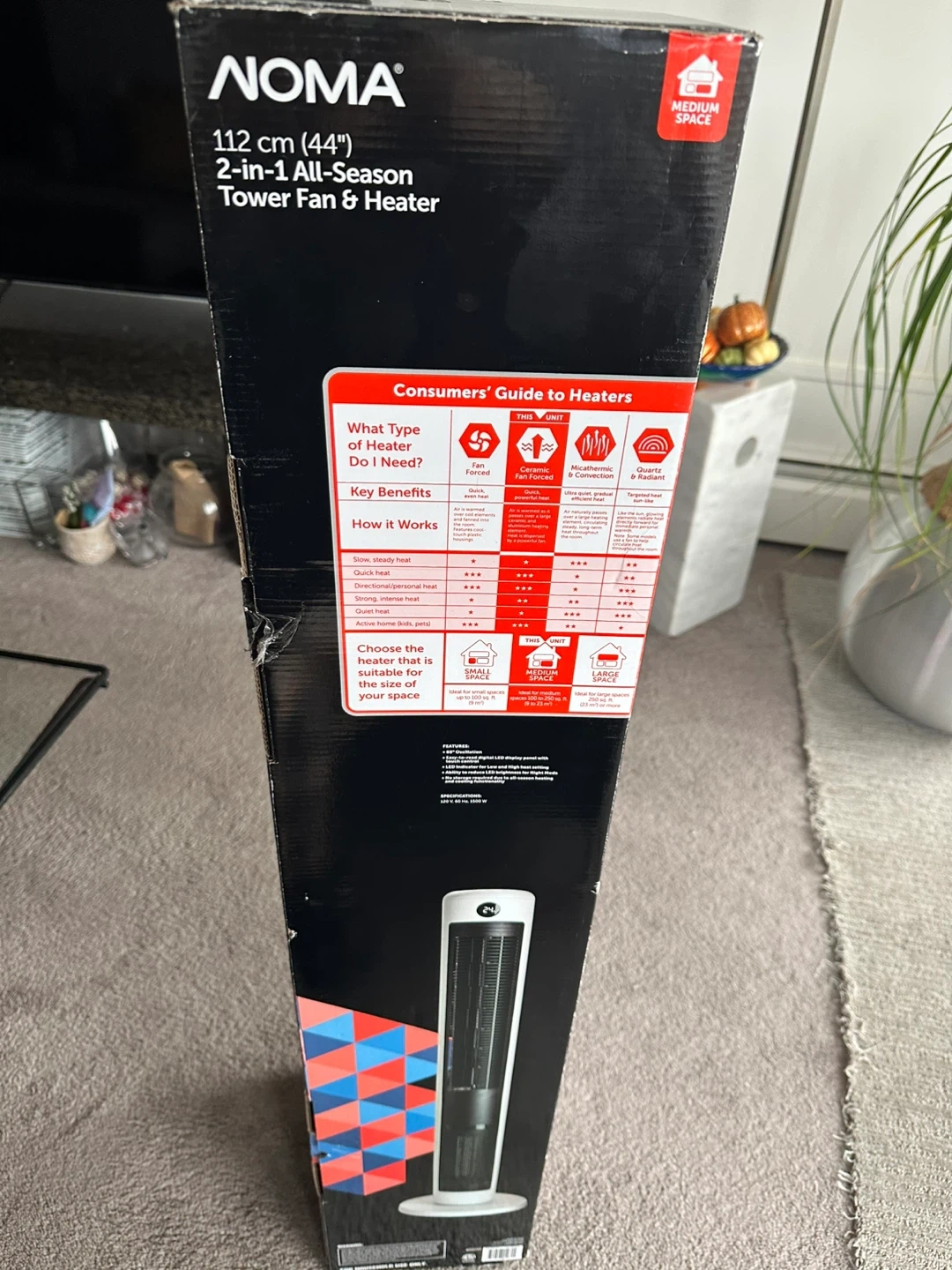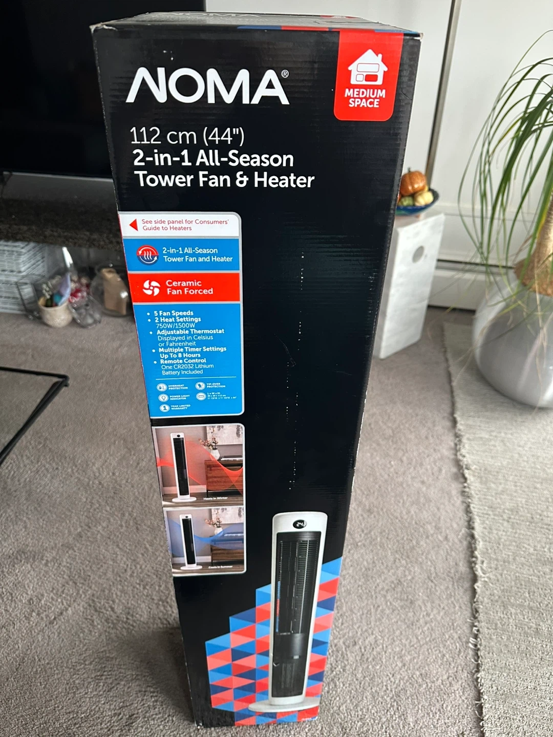 Selling a NOMA 2-in-1 All-Season Tower Fan and Heater. It's 112 cm (44 inches) tall and great for medium-sized spaces. It has 5 fan speeds and multiple heater settings. It also comes with a remote control and a CR2032 battery is included. The box is included!
