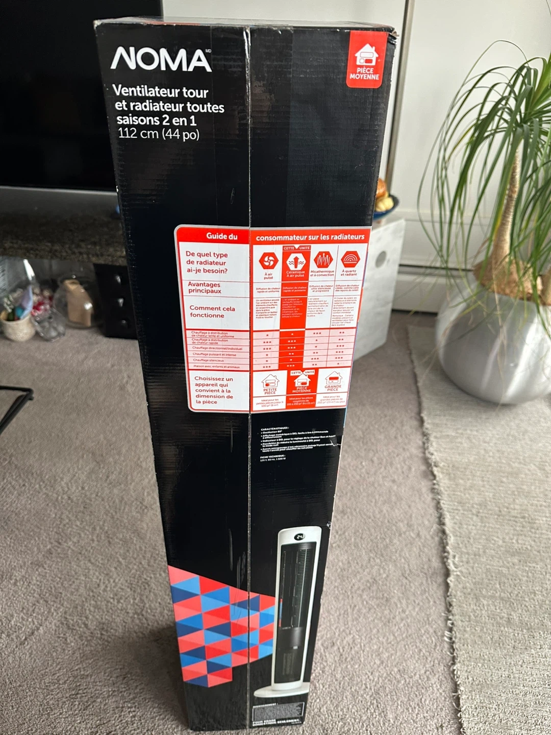 Selling a NOMA 2-in-1 All-Season Tower Fan and Heater. It's 112 cm (44 inches) tall and great for medium-sized spaces. It has 5 fan speeds and multiple heater settings. It also comes with a remote control and a CR2032 battery is included. The box is included!