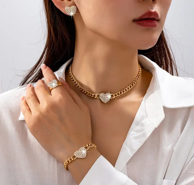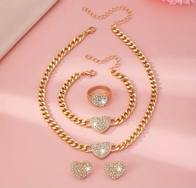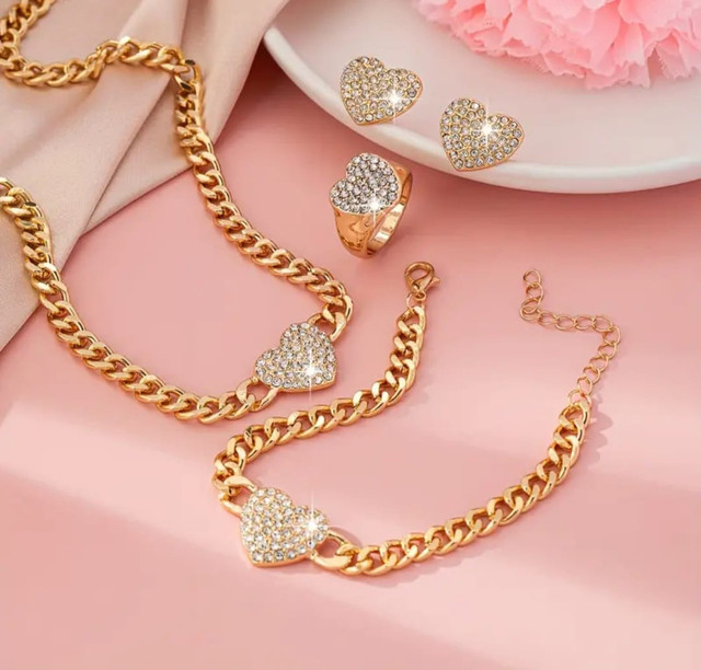 This is a new jewellery set, perfect for adding a touch of glam to any outfit. The set includes a necklace, bracelet, ring and earrings, all with a matching heart and gold design. Features: * Gold chain * Heart pendant * Rhinestone accents. Check out my other listings