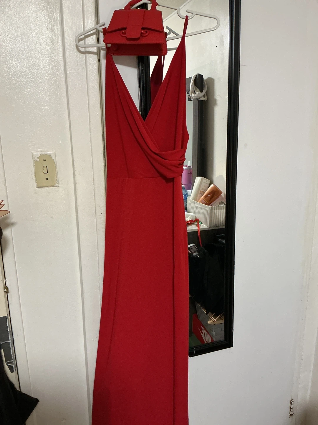 Stunning red maxi dress with a halter neckline and draped detail. It includes a matching clutch bag, perfect for special occasions. This dress is sure to turn heads!