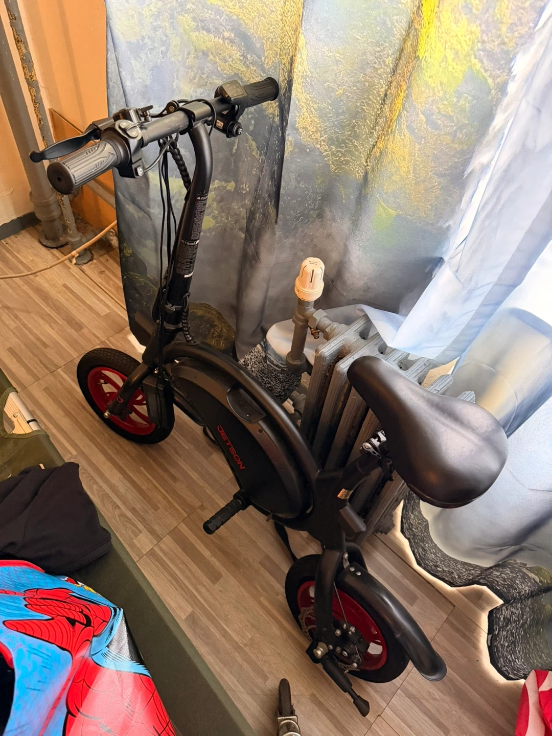 This black Jetson electric folding bike is a convenient way to get around. It features a compact design for easy storage and portability. Perfect for urban commutes or quick trips around town!