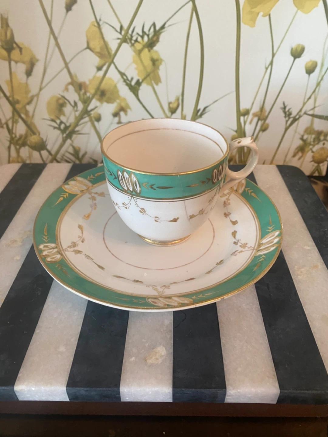 This vintage tea set includes four cups and saucers, along with a matching sugar bowl. The set features a white porcelain base with elegant green and gold trim detailing. It's a beautiful collection for any tea enthusiast!Follow me @casa_s_decor Pick up in the Bronx