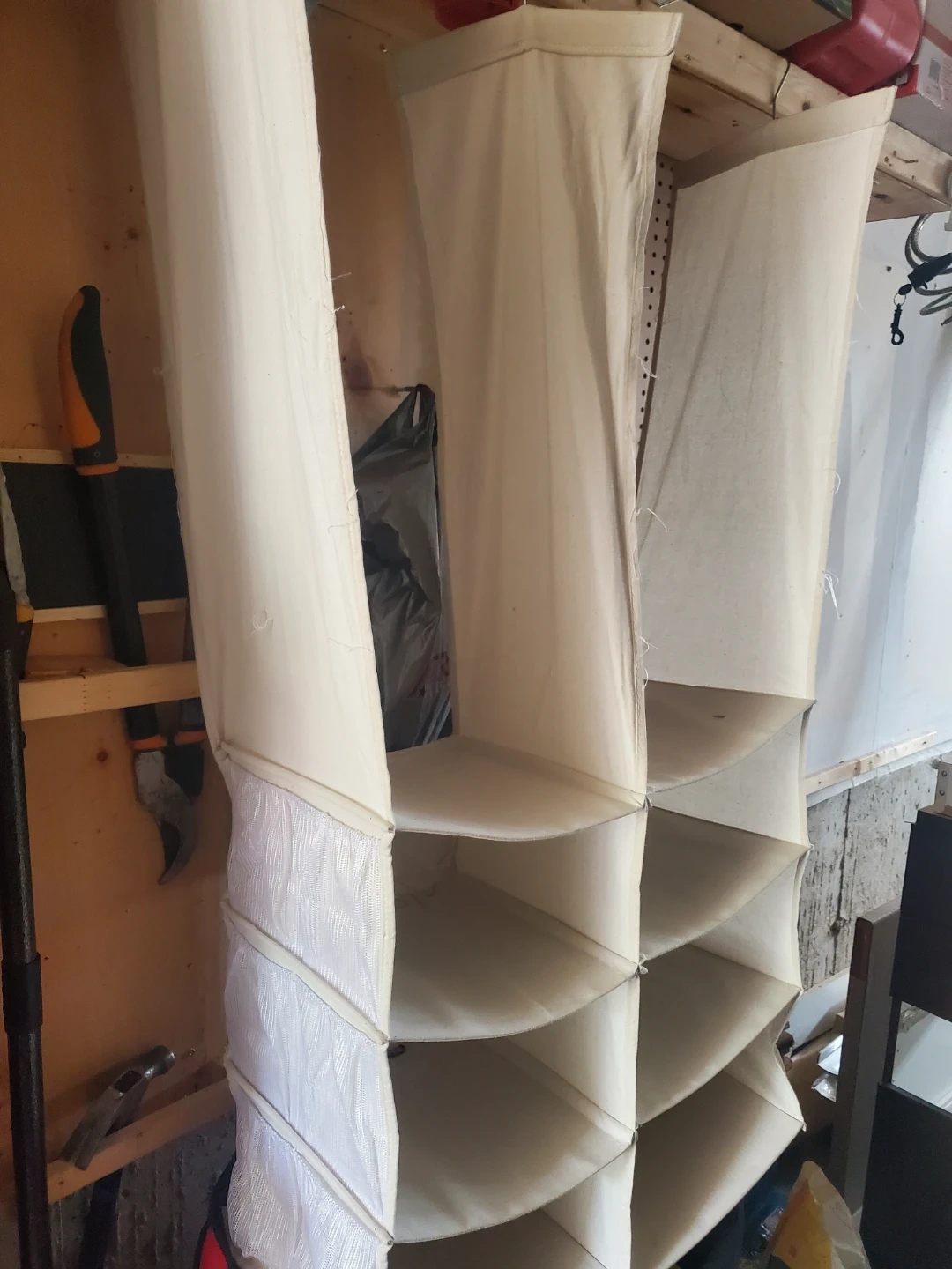 This is a hanging fabric shelving organizer. It's made of a neutral-coloured canvas material and has multiple compartments. It hangs vertically to save space.